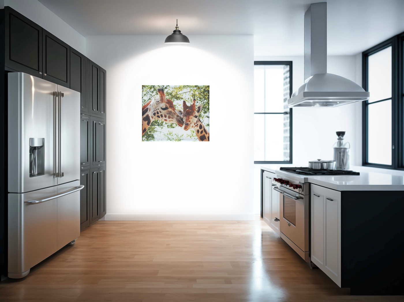 The Giraffes Kiss Canvas print is a beautiful interpretation of the love between partners. The male giraffe holds his head close to the female partners head, as the two share an embrace.