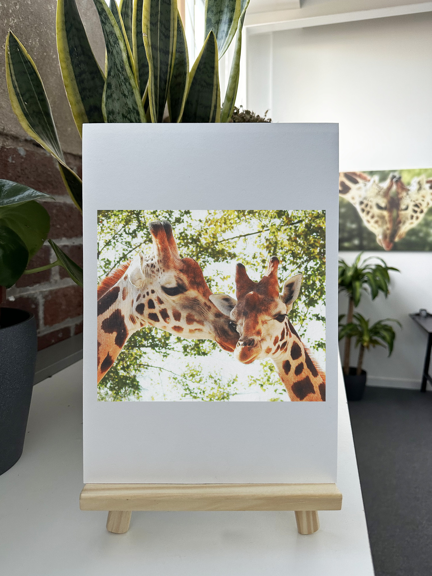 The Giraffes Kiss Fine Art print is a beautiful interpretation of the love between partners. The male giraffe holds his head close to the female partners head, as the two share an embrace.