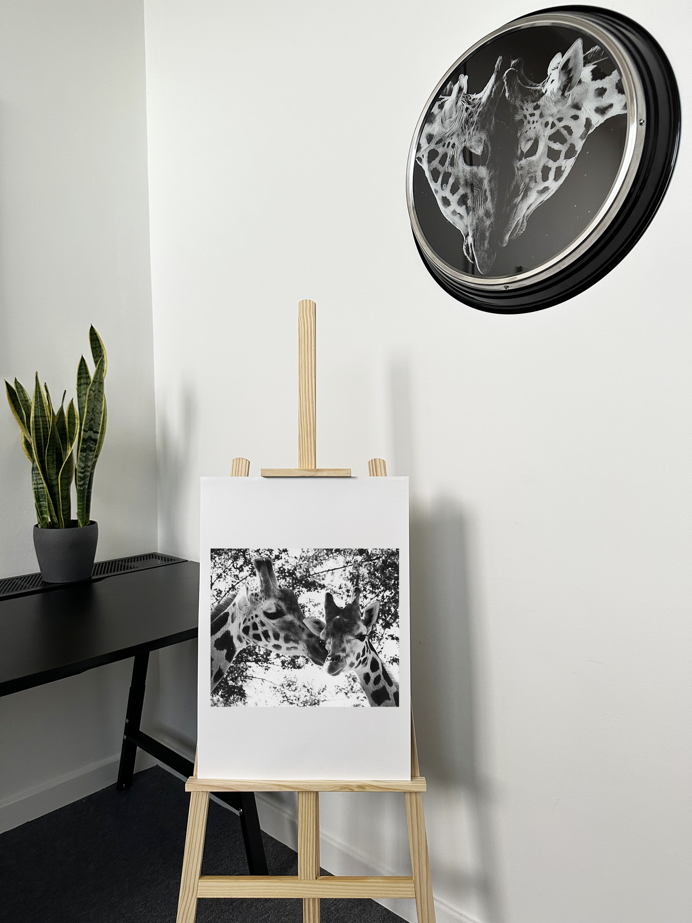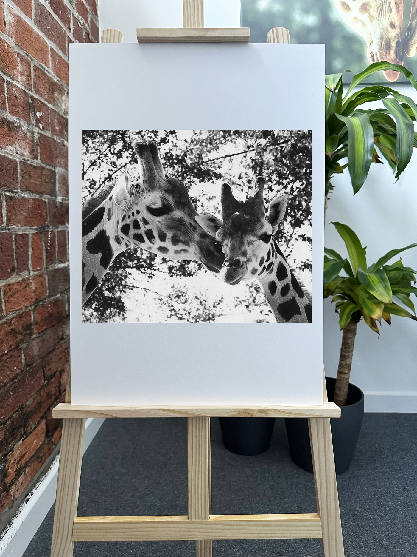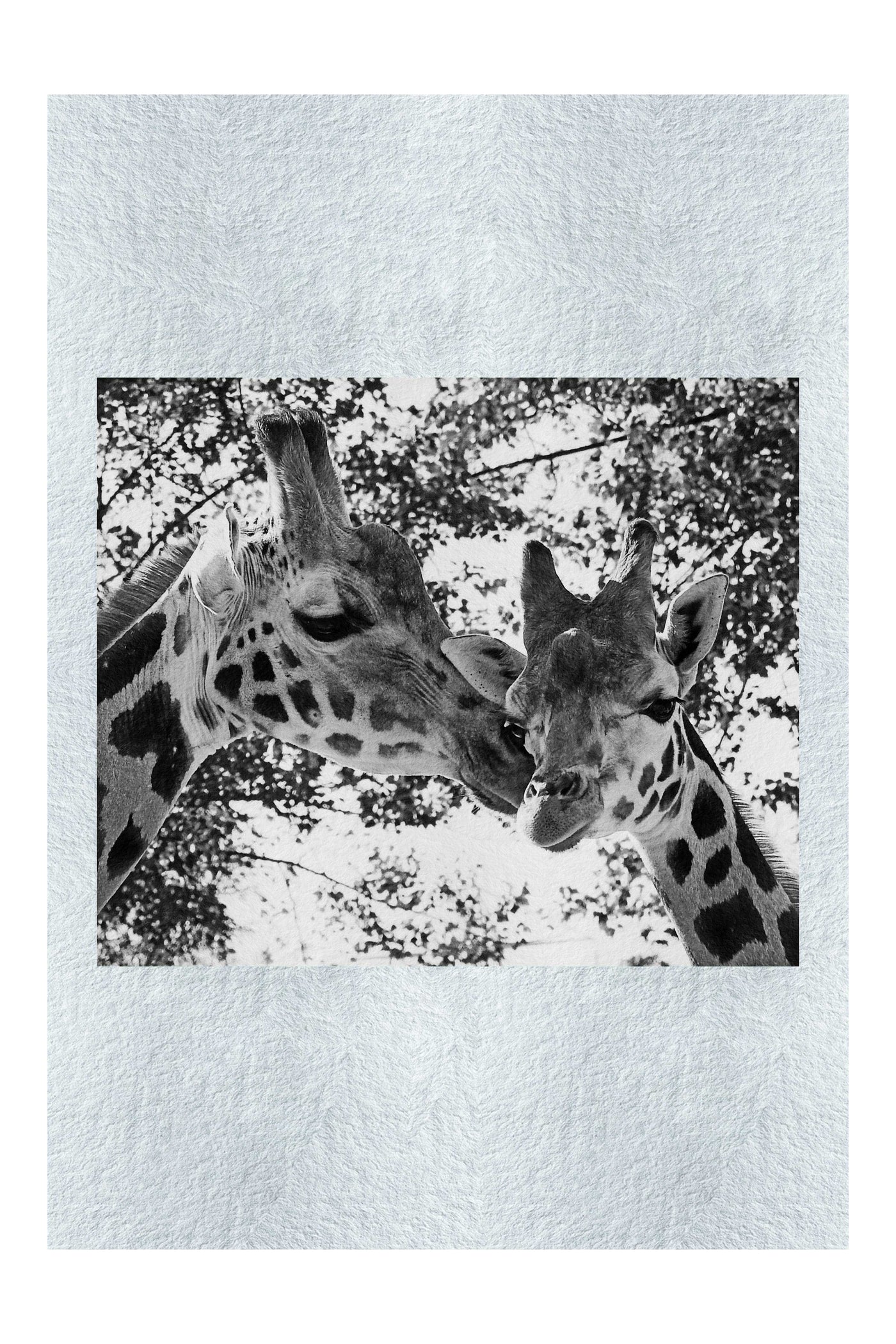 The Giraffes Kiss Monochrome Fine Art print is a beautiful interpretation of the love between partners. The male giraffe holds his head close to the female partners head, as the two share an embrace.