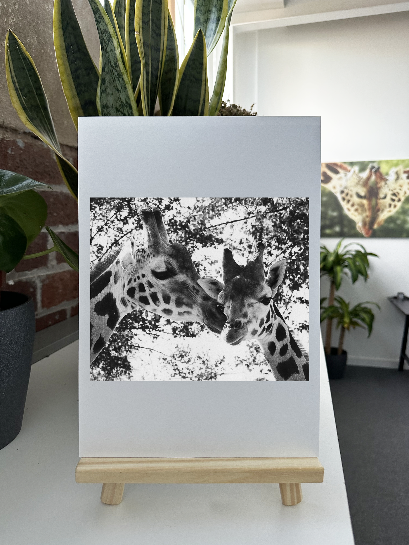 The Giraffes Kiss Monochrome Fine Art print is a beautiful interpretation of the love between partners. The male giraffe holds his head close to the female partners head, as the two share an embrace.
