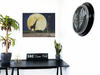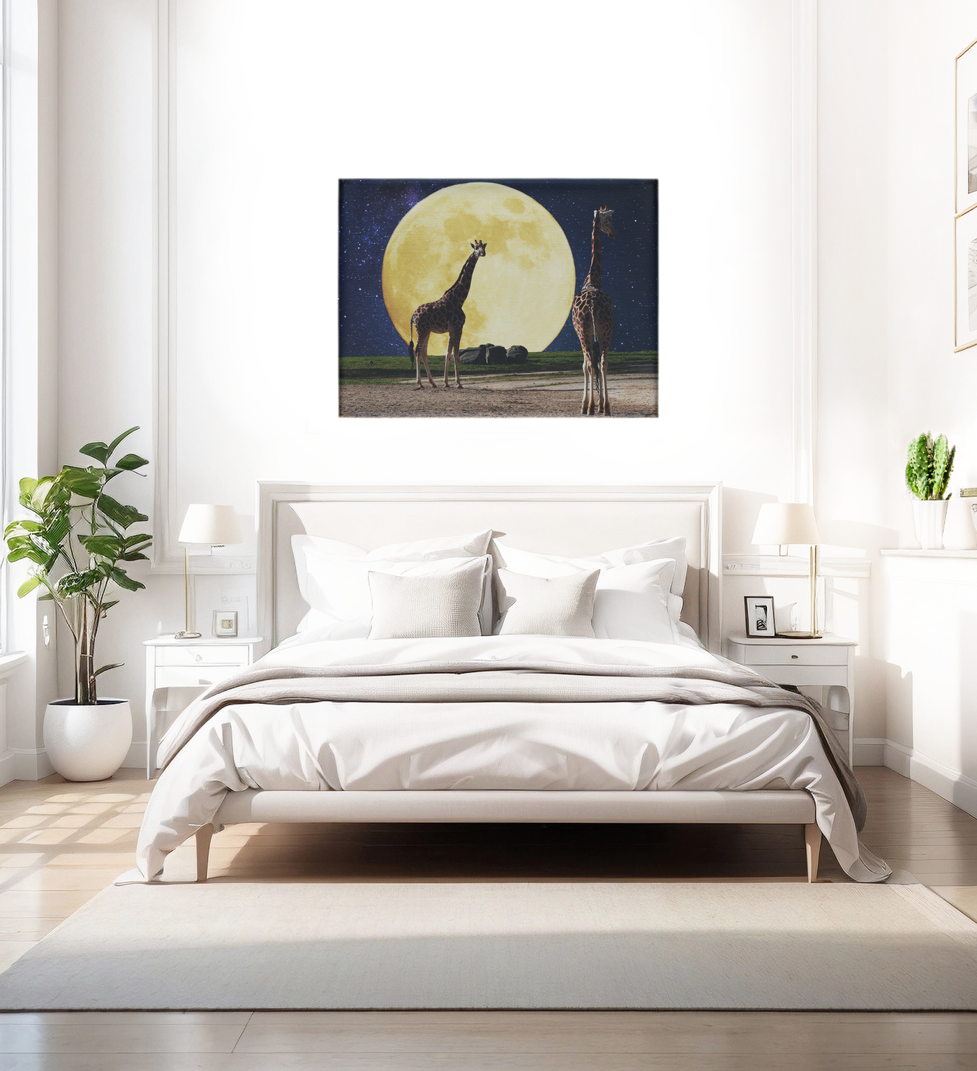 Printed on Canvas, this image takes on a particularly dreamy quality. The texture of the Canvas softens the contrast between the dark silhouettes and the bright moon, enhancing the overall atmospheric effect. The matte finish of the Canvas also helps to reduce glare, allowing viewers to appreciate the subtle details in the moon's surface and the starry sky. This print would be a stunning addition to a bedroom, creating a serene and otherworldly ambiance, or in a living room as a conversation-starting piece that brings a touch of African magic and celestial wonder to any space.