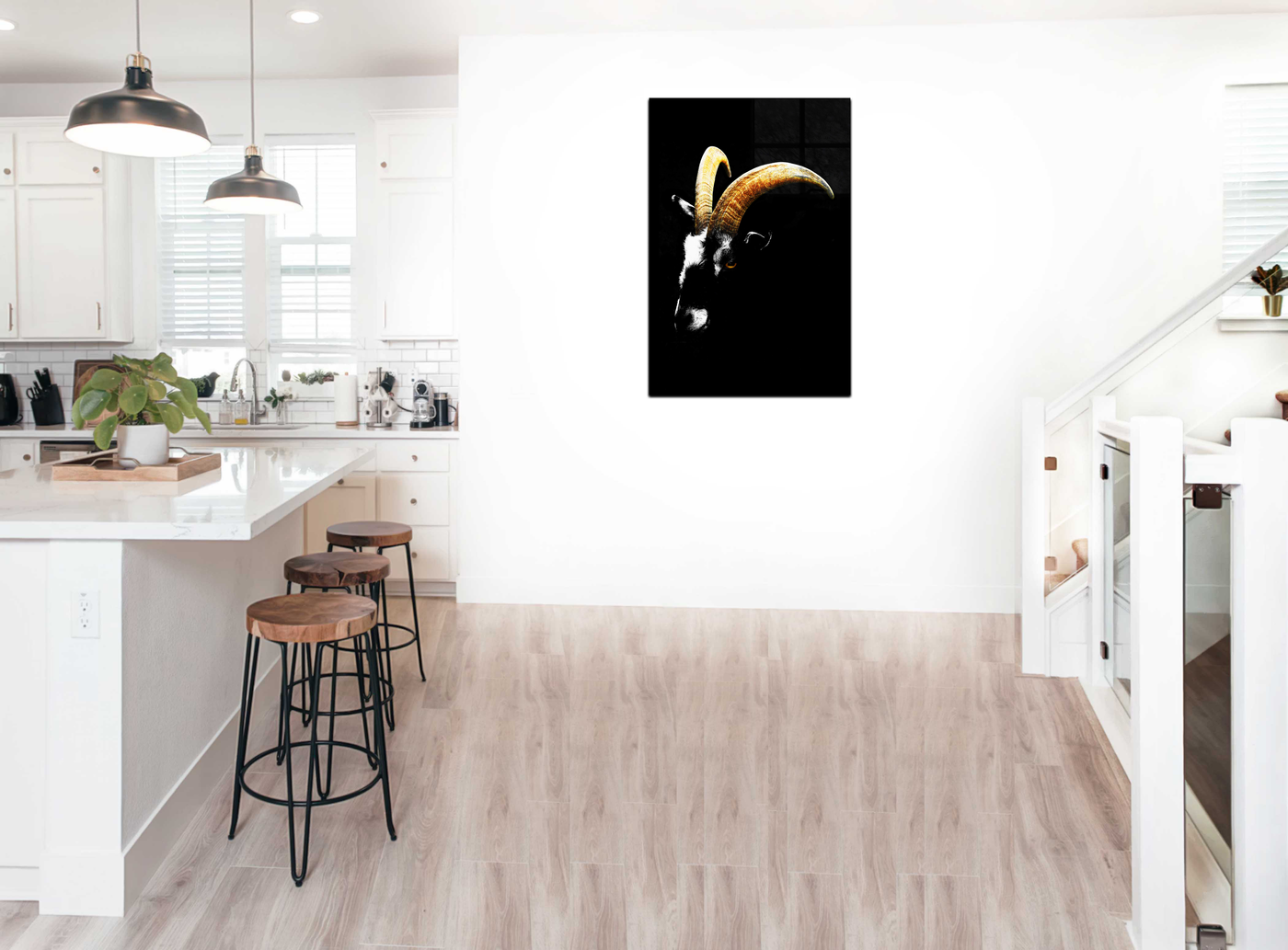 The Goats Head is a Acrylic print of a black goat's head on a solid black background. The goat's long curved horns are the focal point of the picture, accentuating this distinctive feature to stunning effect, while the dark brooding atmosphere captured in the surrounding composition make this a stylish and tasteful addition to any room.