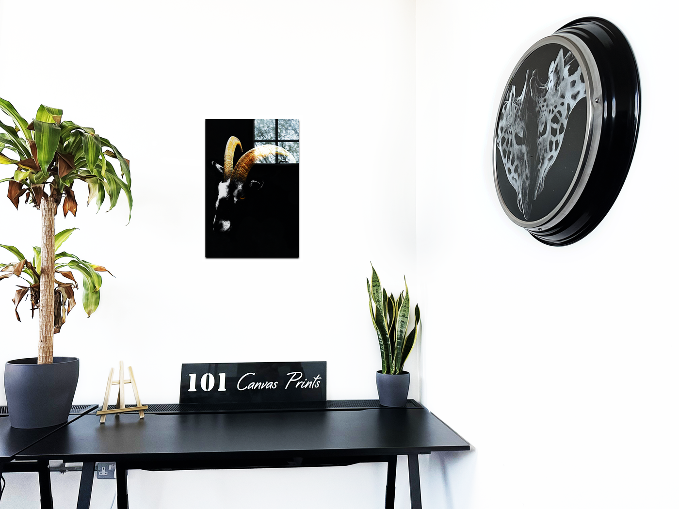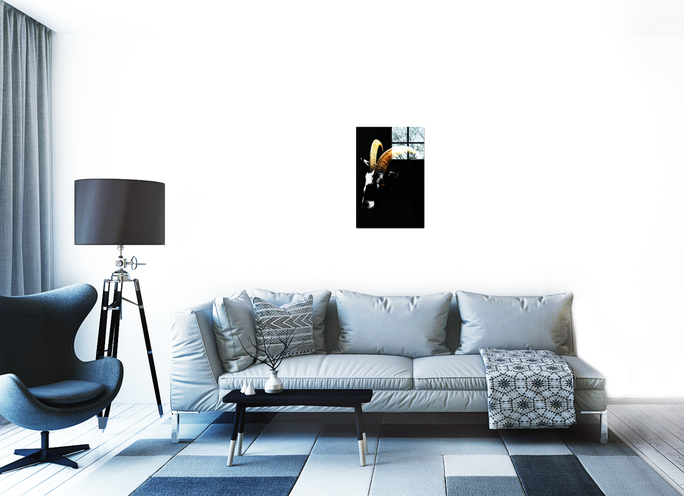 The Goats Head is a Acrylic print of a black goat's head on a solid black background. The goat's long curved horns are the focal point of the picture, accentuating this distinctive feature to stunning effect, while the dark brooding atmosphere captured in the surrounding composition make this a stylish and tasteful addition to any room.