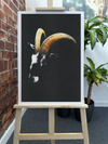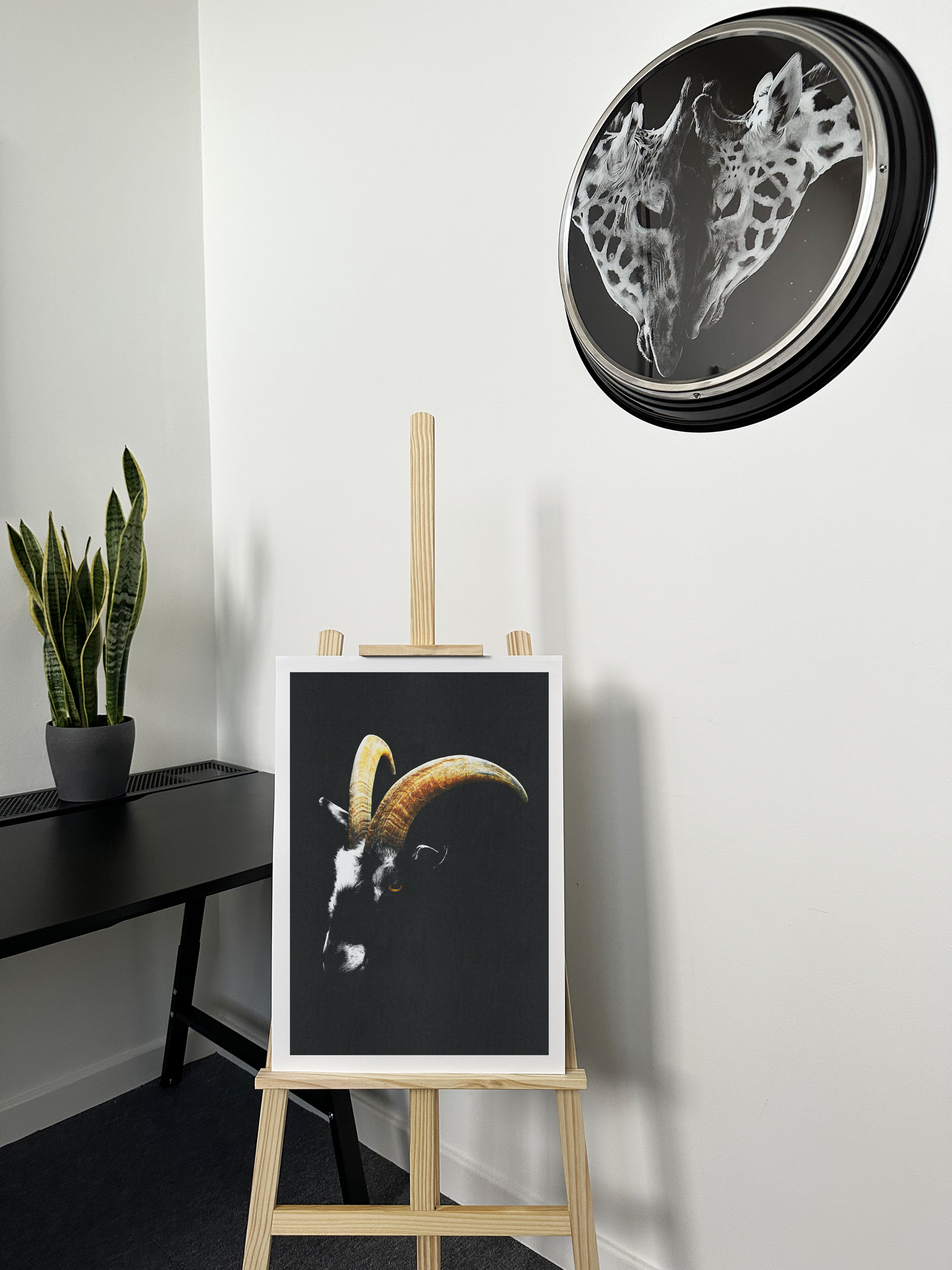 The Goats Head is a Fine Art print of a black goat's head on a solid black background. The goat's long curved horns are the focal point of the picture, accentuating this distinctive feature to stunning effect, while the dark brooding atmosphere captured in the surrounding composition make this a stylish and tasteful addition to any room.