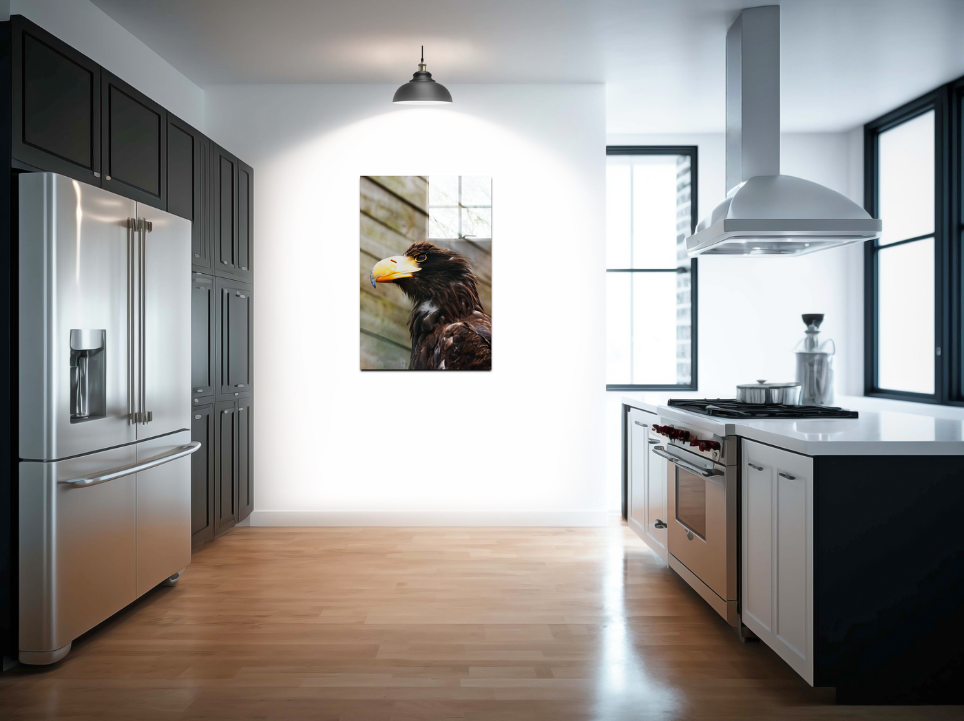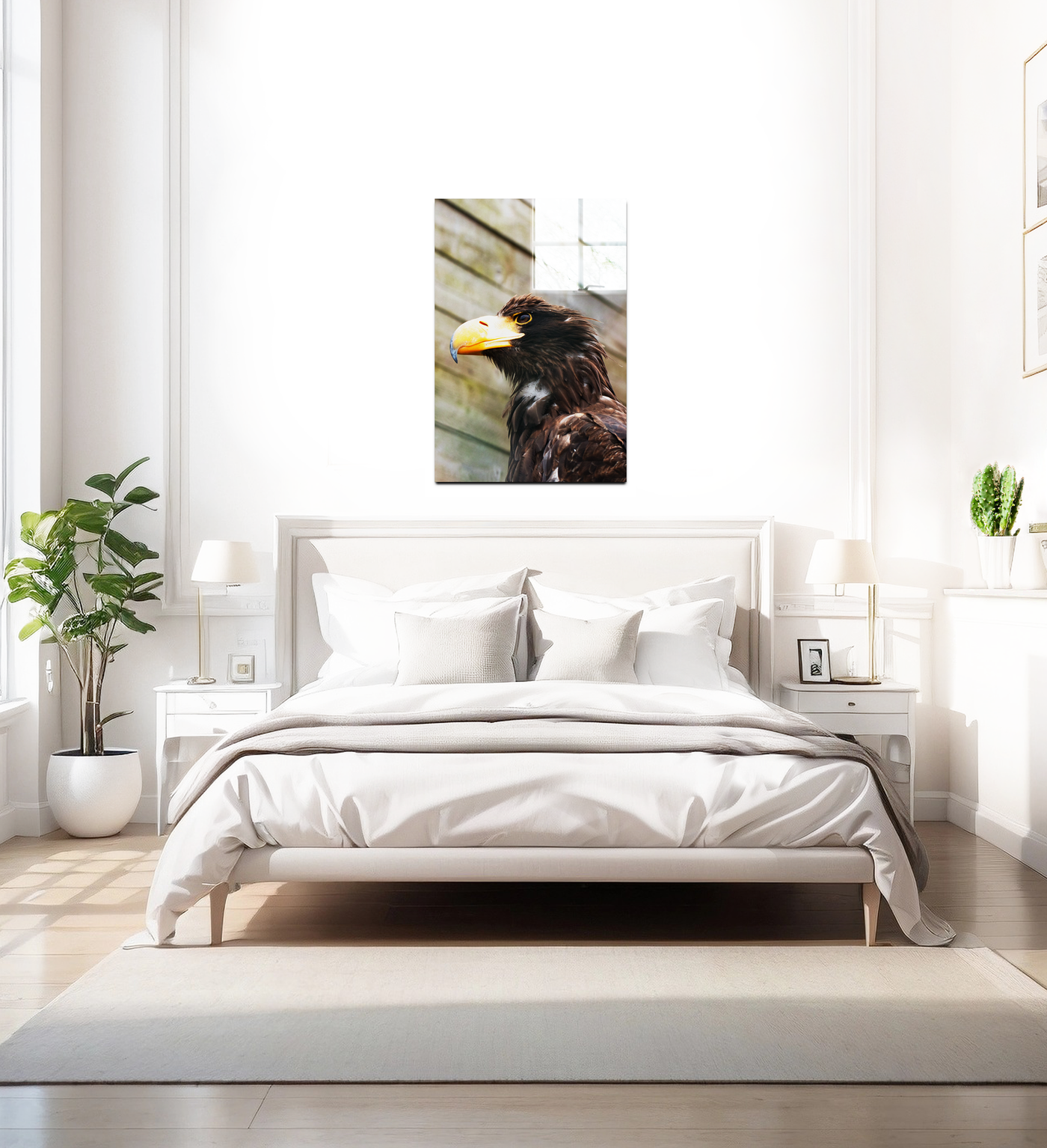 Golden Eagles live throughout the Northern Hemisphere, in Europe, Asia, and North America. Their distinctive shape and soaring flight make them one of the most revered birds of prey. Make this Acrylic print part of your home to admire its uniquely beautiful head and distinctive golden eye.