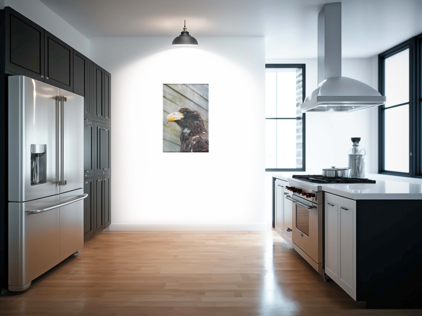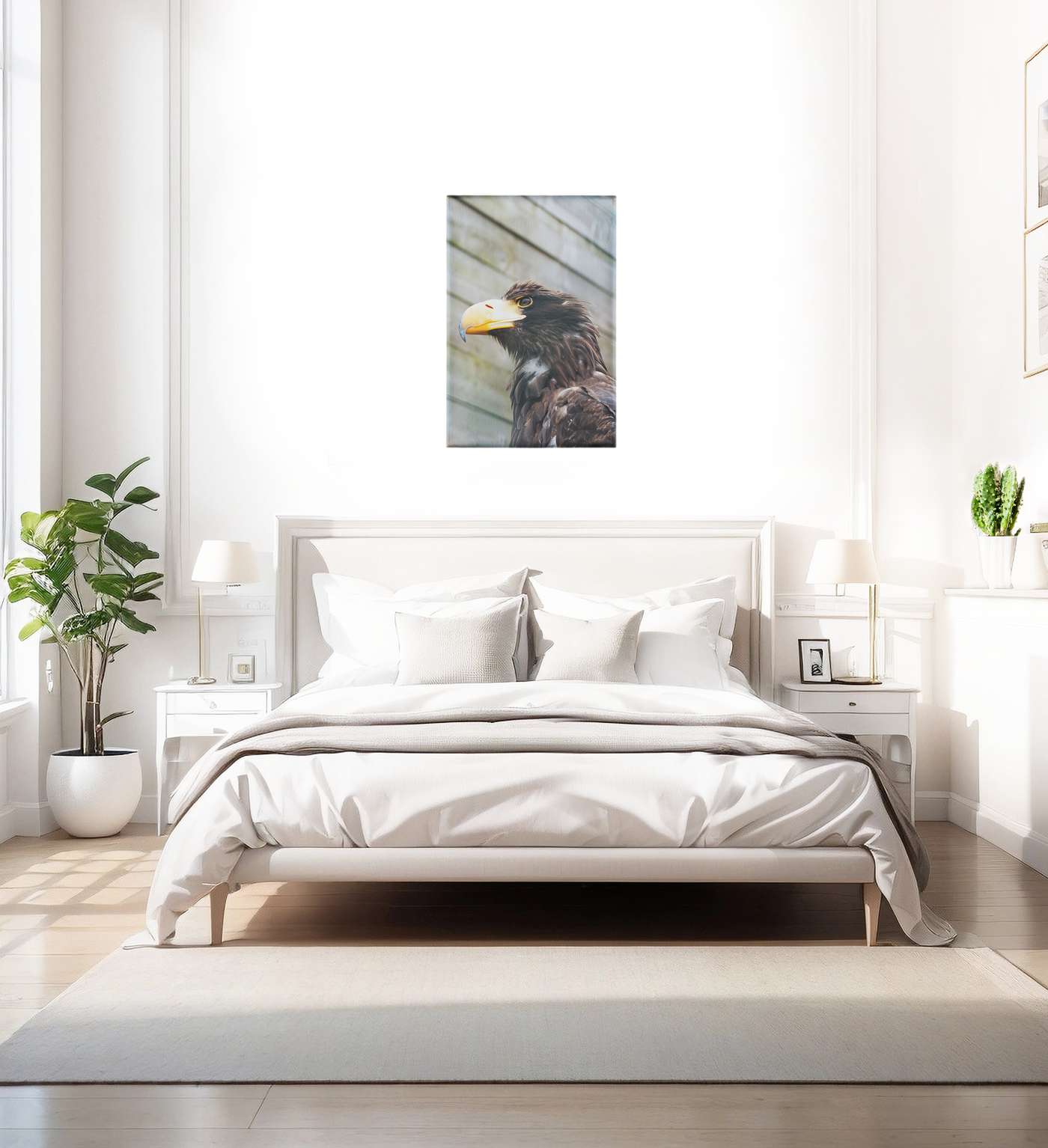Golden Eagles live throughout the Northern Hemisphere, in Europe, Asia, and North America. Their distinctive shape and soaring flight make them one of the most revered birds of prey. Make this Canvas print part of your home to admire its uniquely beautiful head and distinctive golden eye.