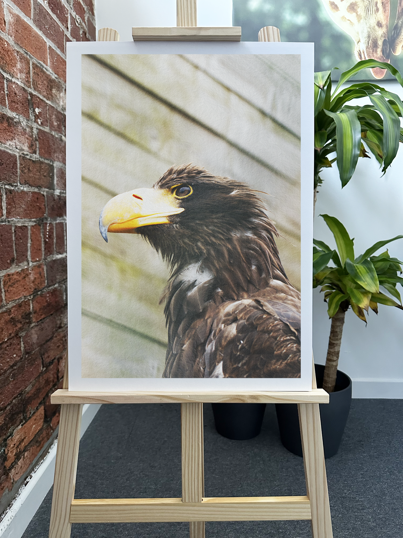 The blurred background of the composition allows the viewer to appreciate the fierce intensity on display, emphasising the blazing eyes of this majestic bird and its muscular neck and powerful beak.