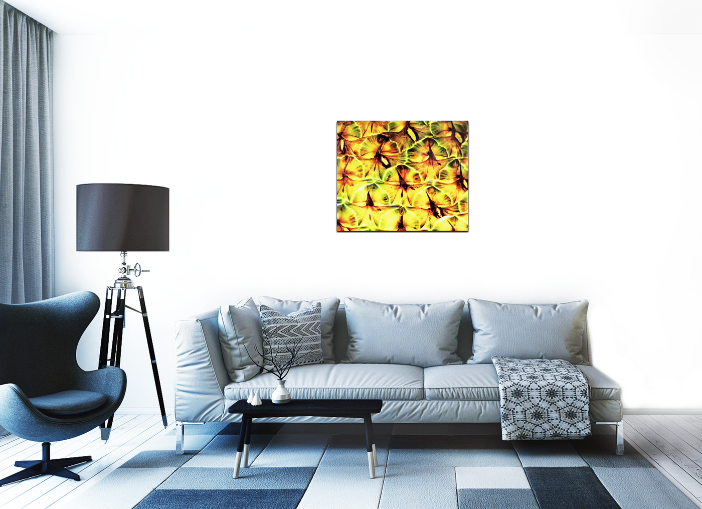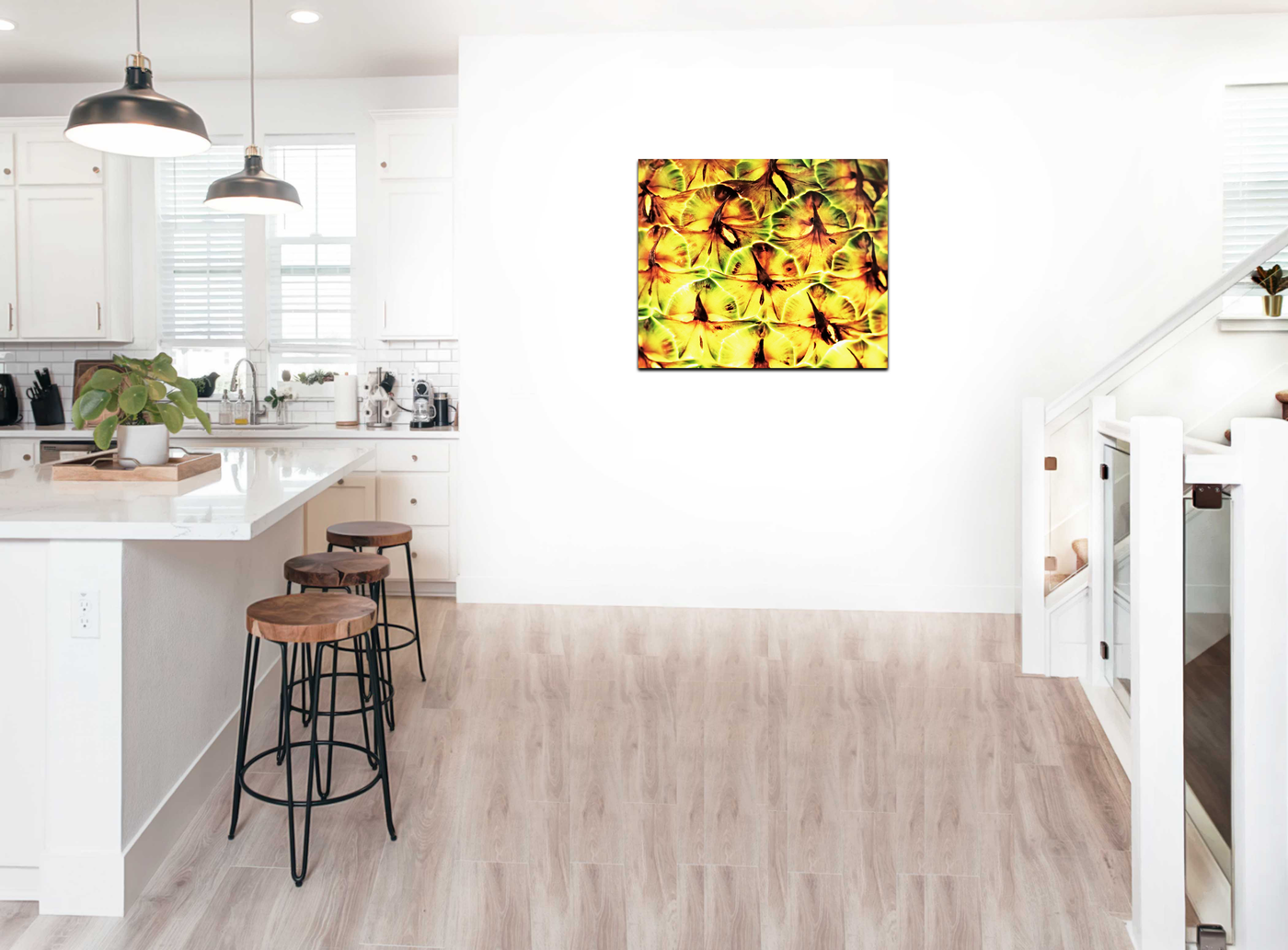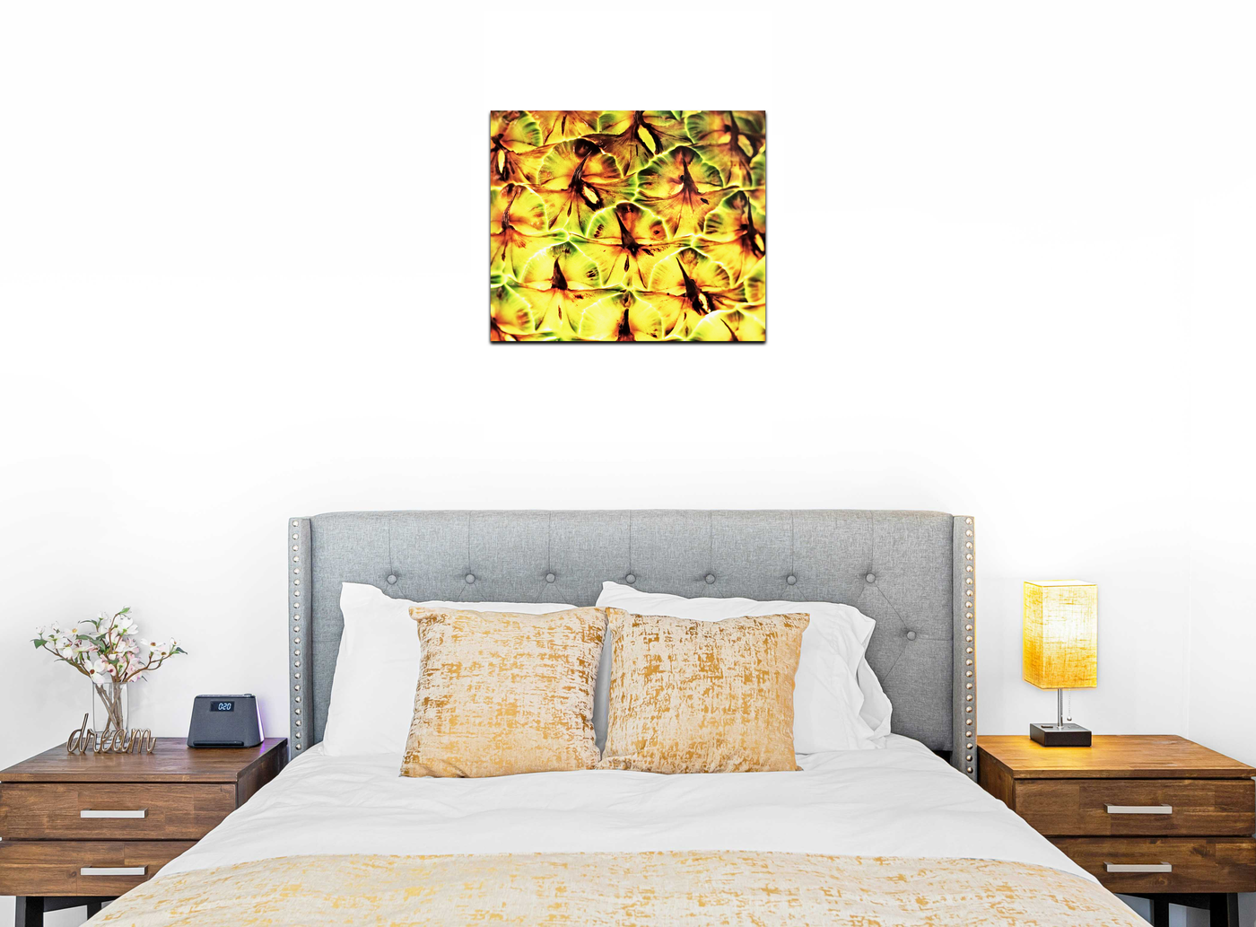 The colour scheme is a vibrant celebration of tropical warmth. Rich golden yellows form the base, accented by lively greens and deep, earthy browns. The 101 Canvas Prints team have expertly captured the way light plays across the pineapple's textured surface, creating an almost luminous quality. Each individual scale of the fruit appears to glow, resulting in a mesmerising mosaic effect that draws the eye across the entire image.