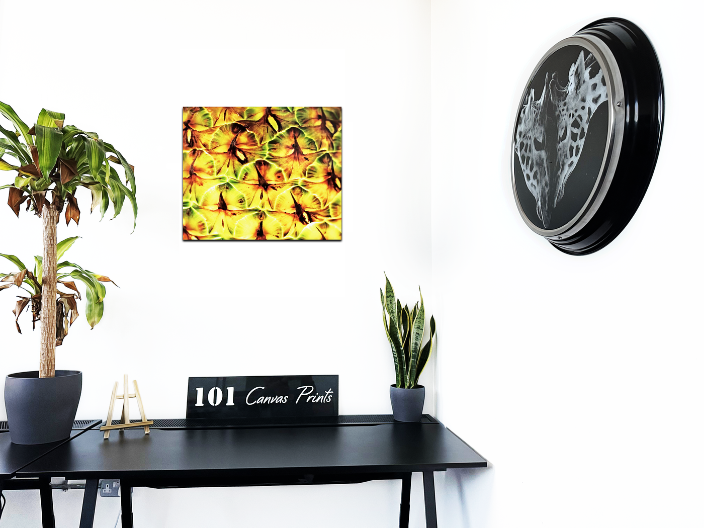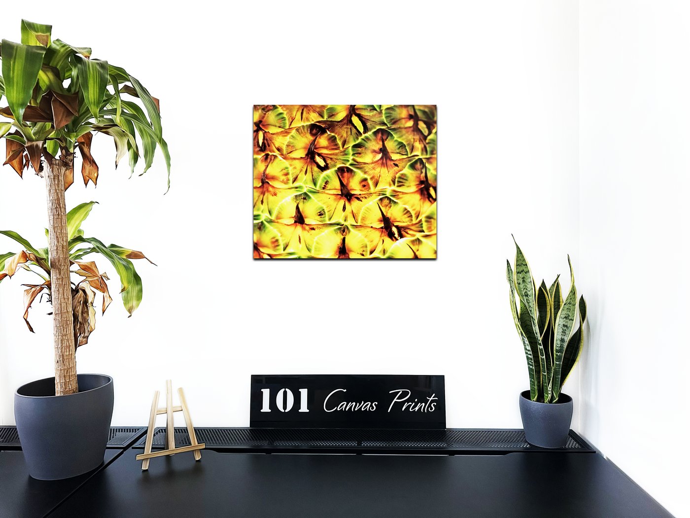 This captivating photograph, masterfully composed by the 101 Canvas Prints photography team, presents a unique and abstract view of a pineapple's surface. The image zooms in on the fruit's intricate pattern, transforming the familiar into a stunning exploration of natural geometry and colour. By filling the entire frame with this detailed view, the photographers invite viewers to appreciate the complex beauty found in everyday objects.