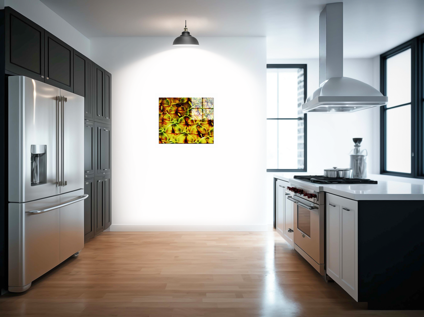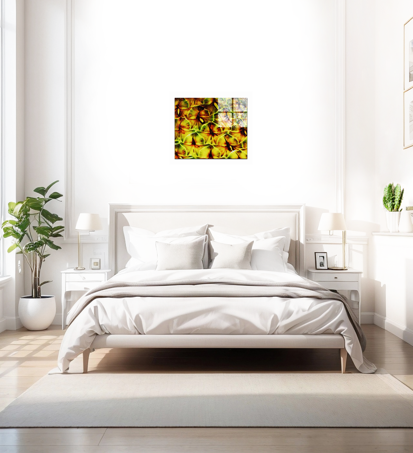 This Acrylic print would make a stunning statement piece in a contemporary dining area, add a pop of colour and interest to a neutral living space, or bring a touch of natural artistry to a modern office setting. The unique perspective and vivid colours of this acrylic-set print make it an eye-catching addition to any interior, particularly those with a modern, tropical, or artistic flair.