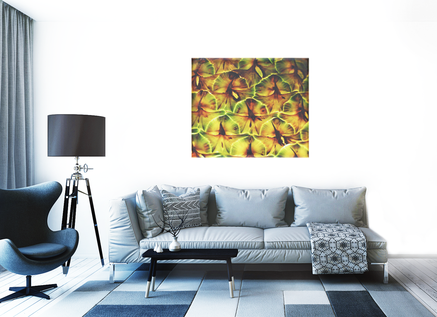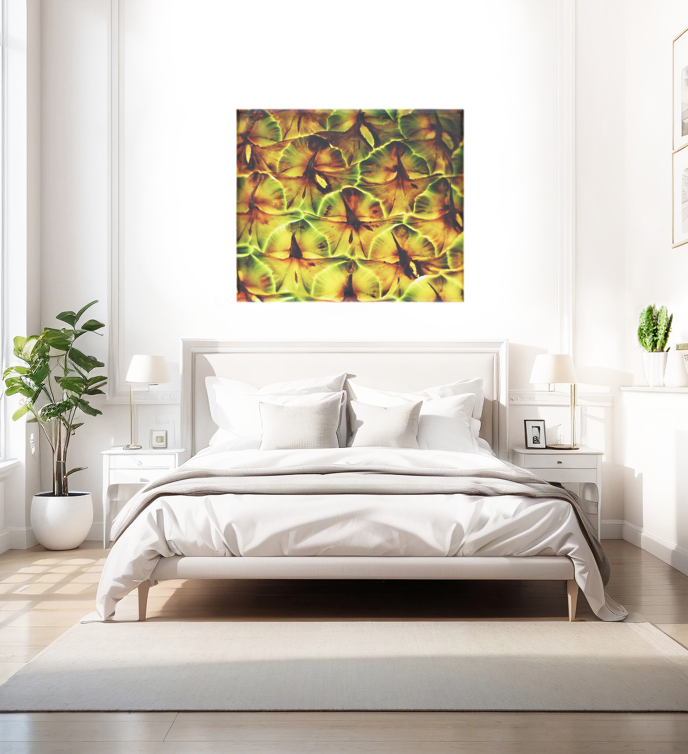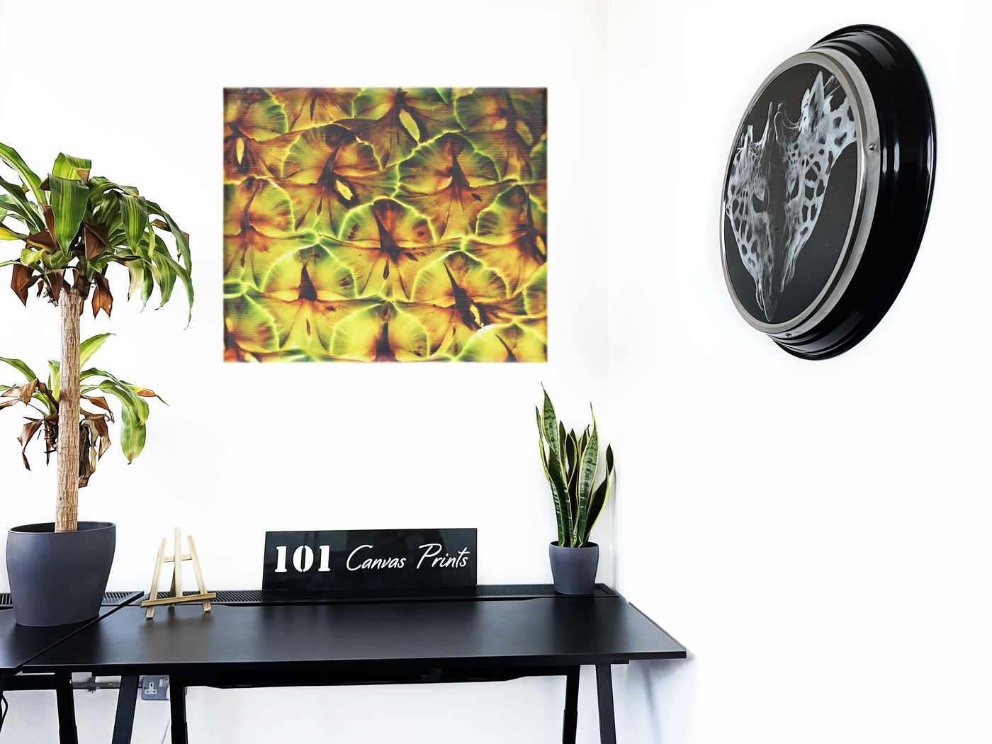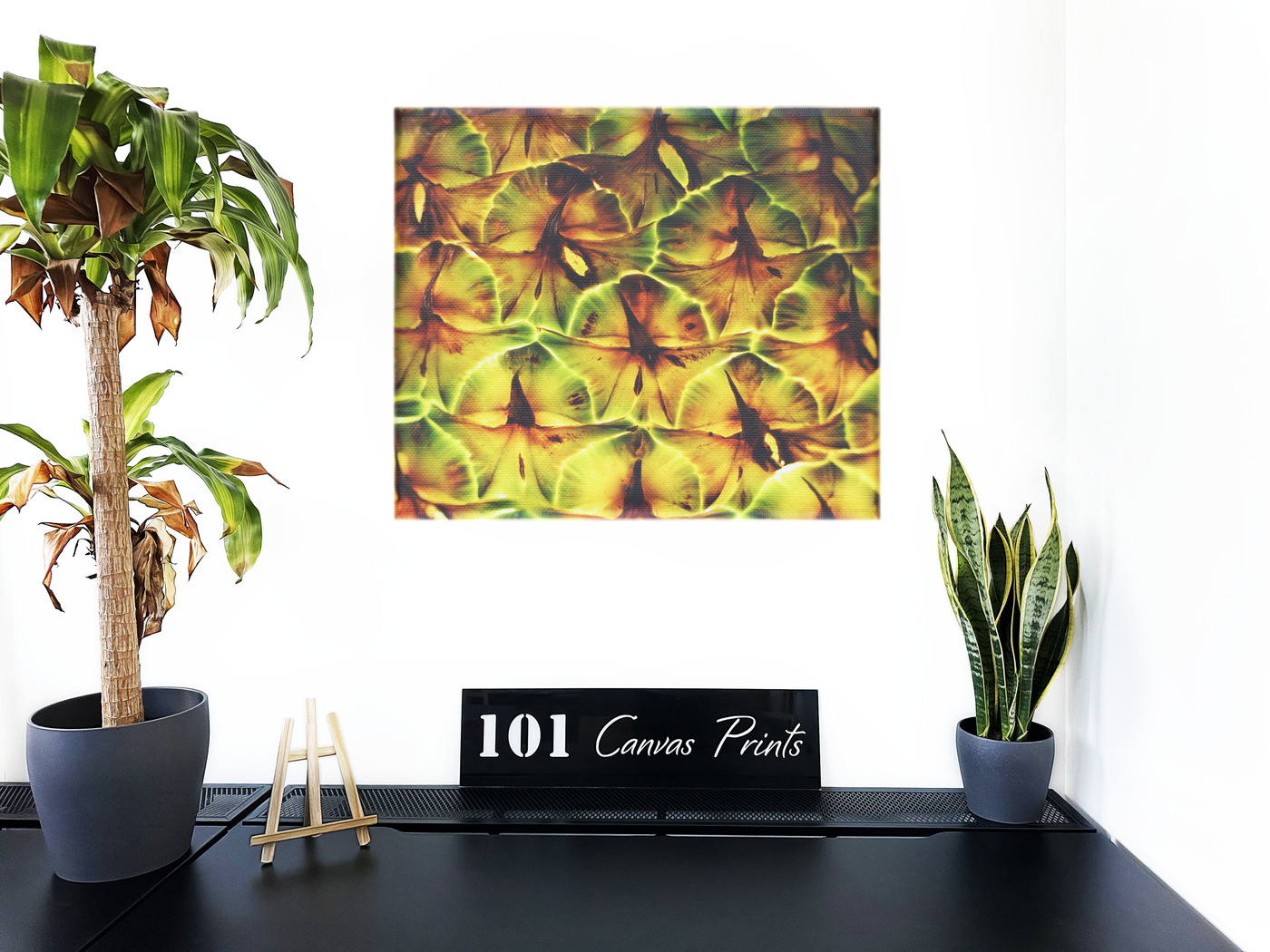 The colour palette is a rich tapestry of warm hues. Golden yellows dominate, interspersed with vibrant greens and deep, russet browns. The 101 Canvas Prints team have skilfully captured the interplay of light across the pineapple's surface, highlighting the fruit's complex structure. Each scale seems to glow from within, creating an almost stained-glass effect that adds depth and dimensionality to the image.