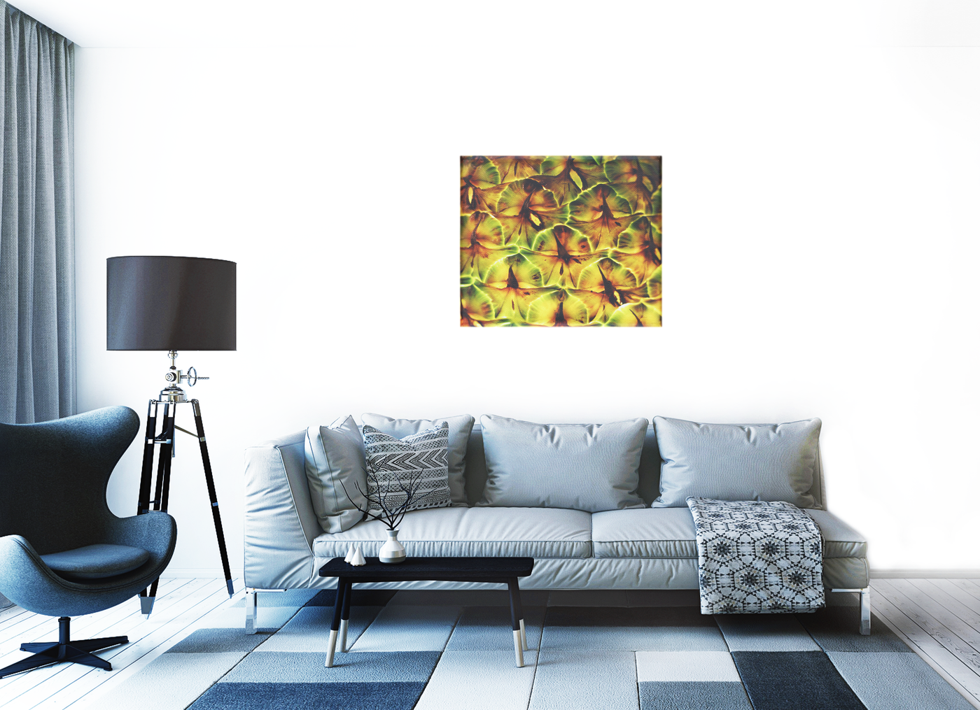 The colour palette is a rich tapestry of warm hues. Golden yellows dominate, interspersed with vibrant greens and deep, russet browns. The 101 Canvas Prints team have skilfully captured the interplay of light across the pineapple's surface, highlighting the fruit's complex structure. Each scale seems to glow from within, creating an almost stained-glass effect that adds depth and dimensionality to the image.