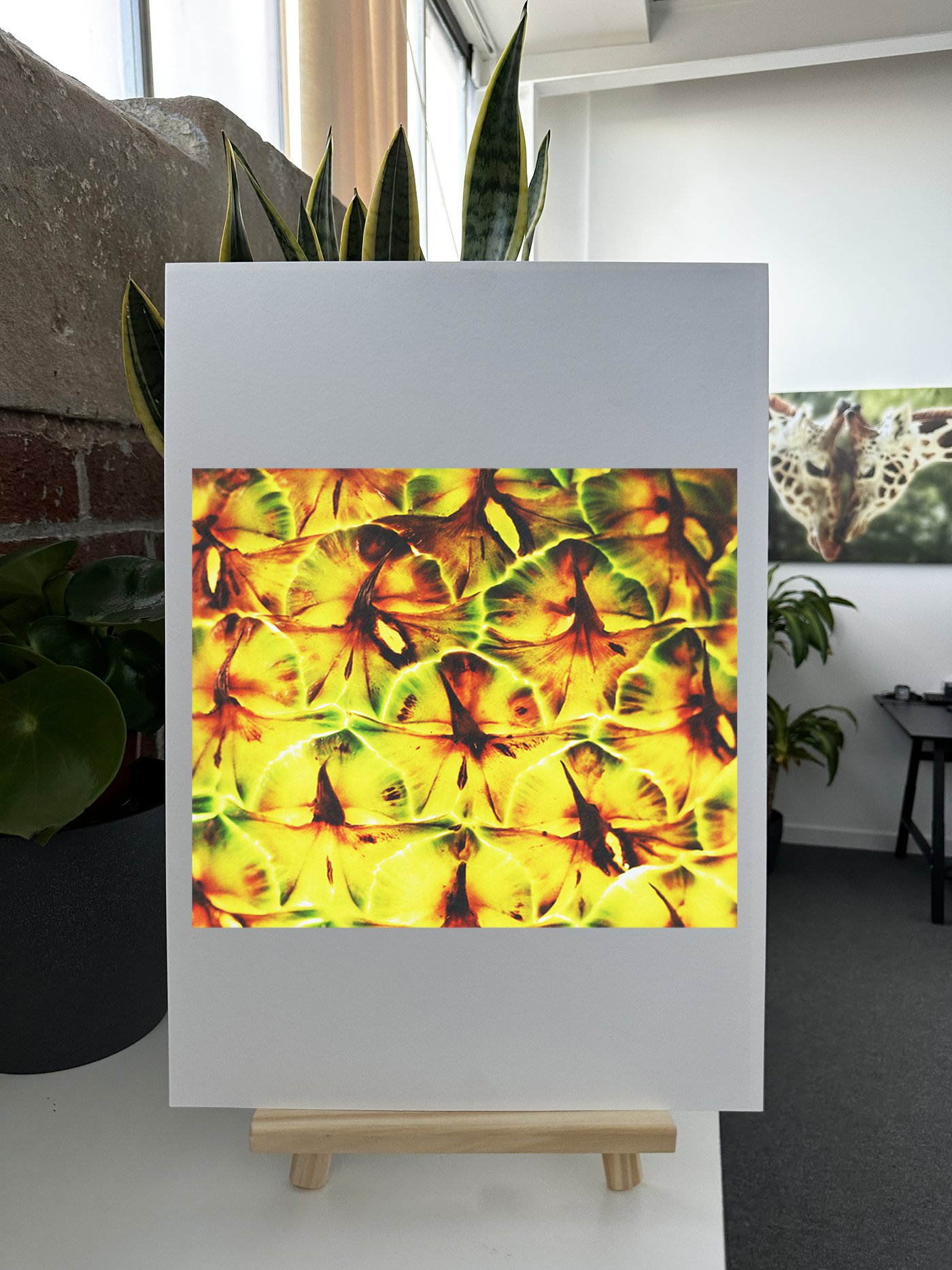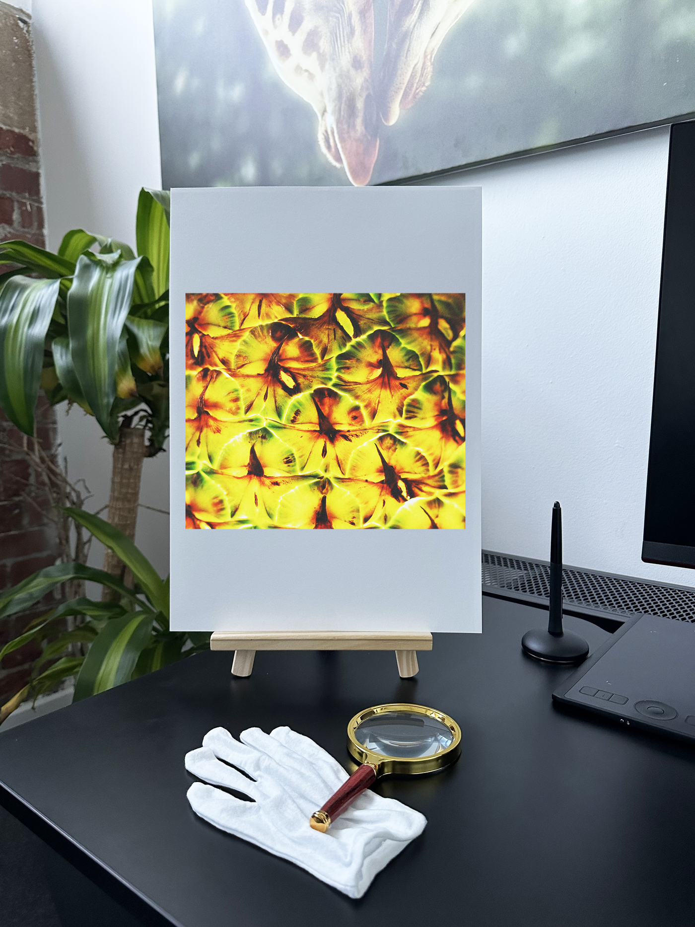 This is a striking Fine Art piece that would add a burst of tropical elegance to a dining room, create a focal point in a modern kitchen, or bring a touch of natural geometry to a living space or office. Its versatile aesthetic makes it suitable for various interior styles, from contemporary to eclectic.