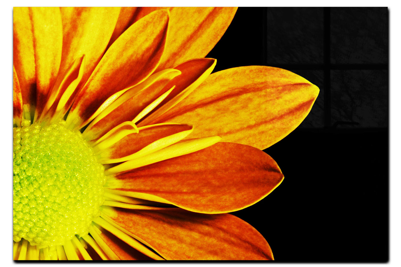 This captivating image presents a close-up view of a daisy, showcasing the flower's graceful structure and vibrant colours. The composition artfully frames a section of the bloom, with golden petals radiating outwards, creating a sense of movement and energy. The detailed perspective reveals the subtle gradations in colour and the delicate textures of both petals and centre.