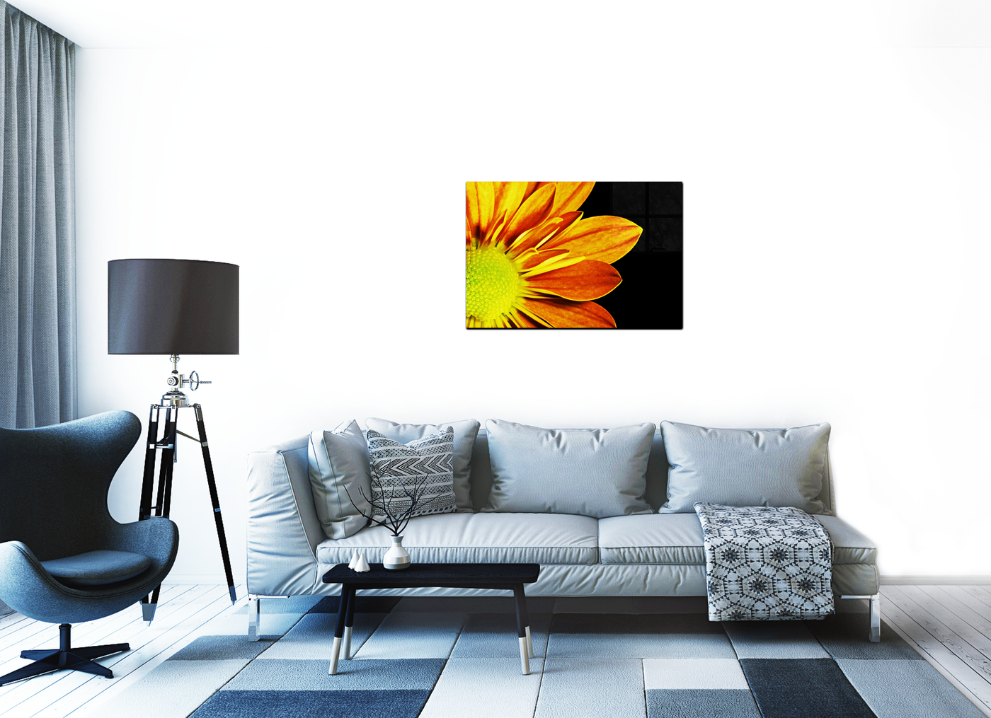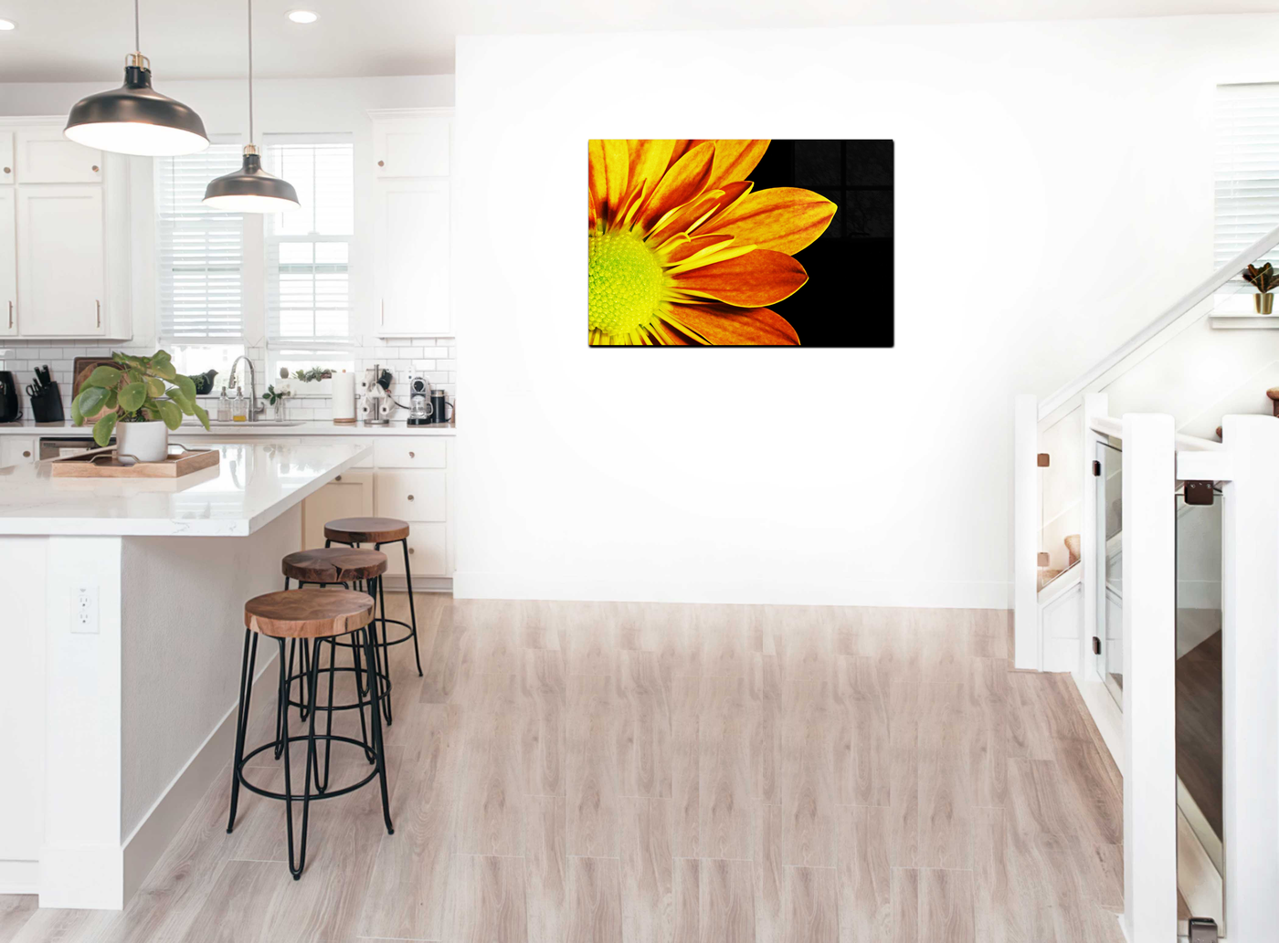 The acrylic-set print's glossy finish amplifies the daisy's vibrancy, making the yellows appear even more intense and life-like. It enhances the contrast between the radiant flower and the deep black background, creating a dramatic visual impact. 101 Canvas Prints' skilled photographers have produced a piece that comes alive in contemporary living rooms, wellness spaces, or professional offices. In these settings, the print's vivid colours and crisp details invite viewers to pause and appreciate the simple yet profound beauty of a single bloom.
