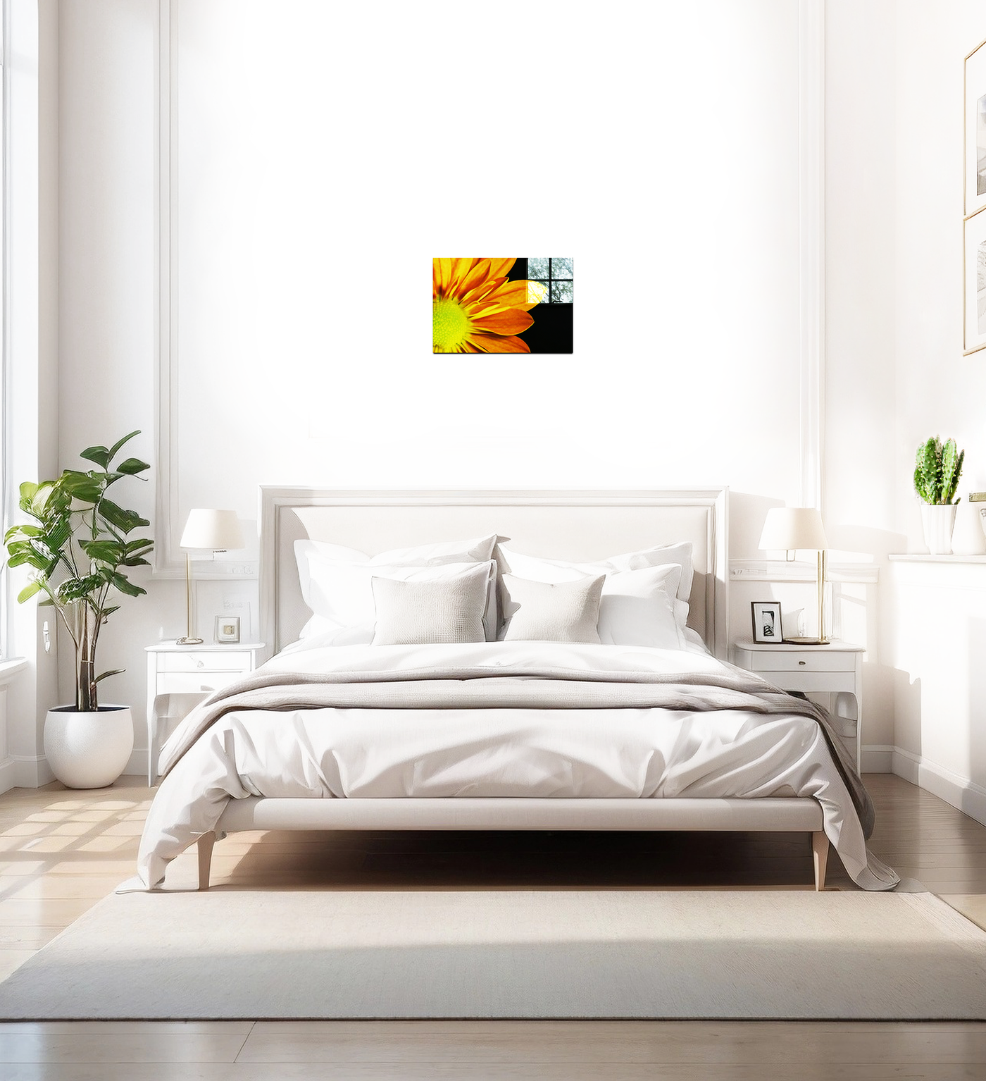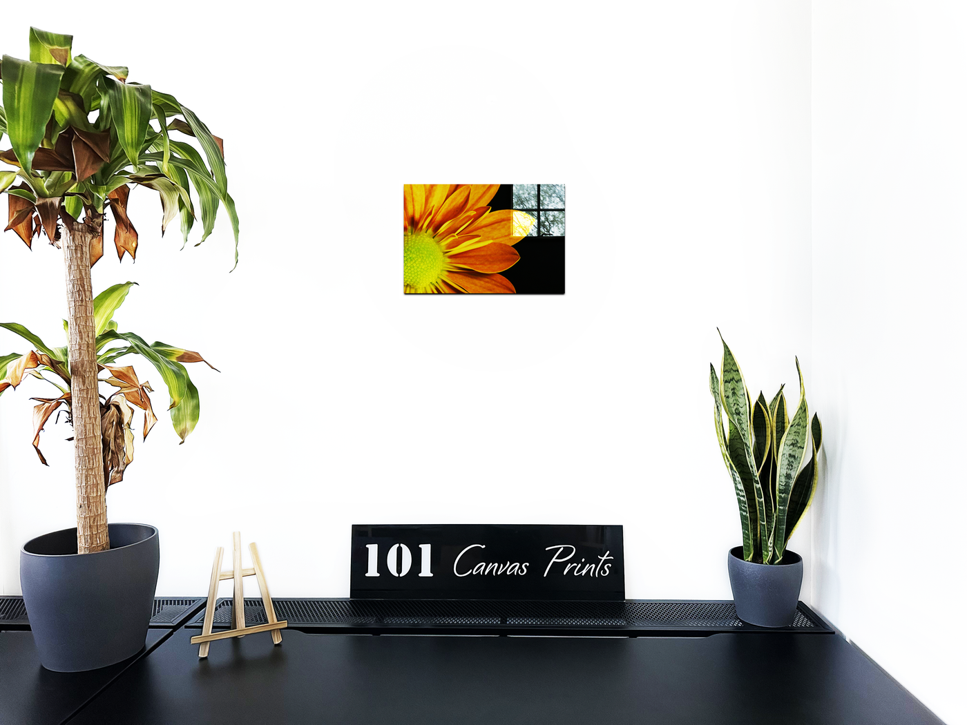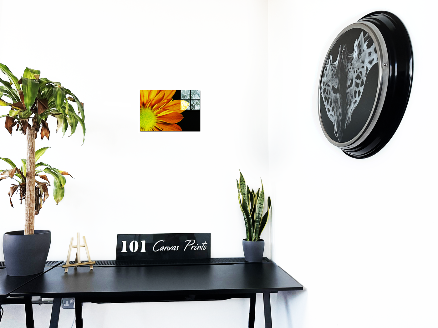 The acrylic-set print's glossy finish amplifies the daisy's vibrancy, making the yellows appear even more intense and life-like. It enhances the contrast between the radiant flower and the deep black background, creating a dramatic visual impact. 101 Canvas Prints' skilled photographers have produced a piece that comes alive in contemporary living rooms, wellness spaces, or professional offices. In these settings, the print's vivid colours and crisp details invite viewers to pause and appreciate the simple yet profound beauty of a single bloom.