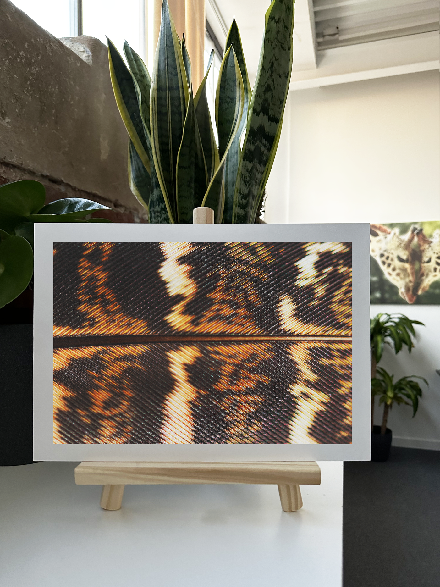 Rendered on Fine Art paper, this image takes on a particularly fitting quality. The natural texture of the Fine Art print complements the organic subject matter, enhancing the perception of the feather's own texture. The matte finish of the Fine Art paper softens the contrast slightly, creating a more nuanced representation of the feather's subtle colour variations. This print would be an excellent addition to a variety of spaces, from a rustic-themed study to a modern living room, where its blend of natural subject matter and abstract composition could serve as a fascinating focal point, bridging the gap between representational and abstract art.