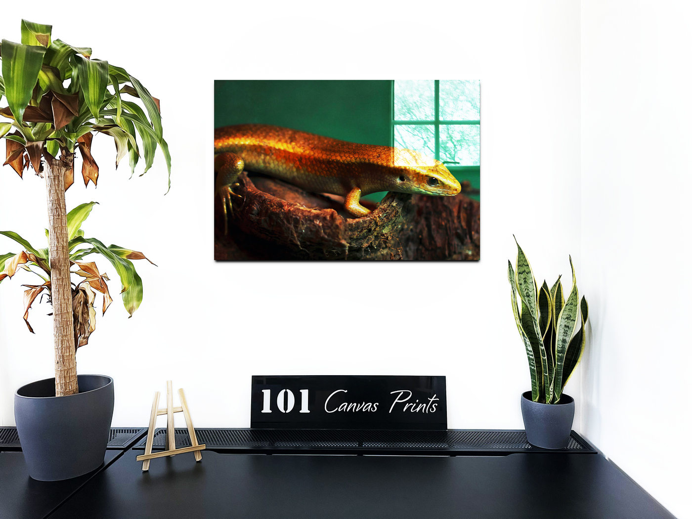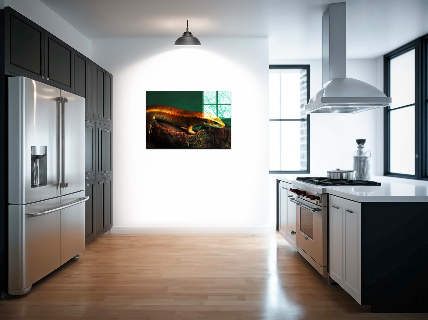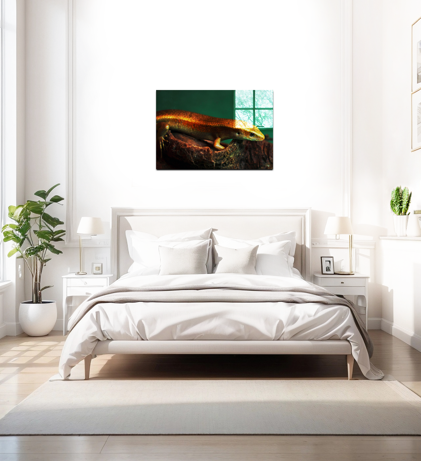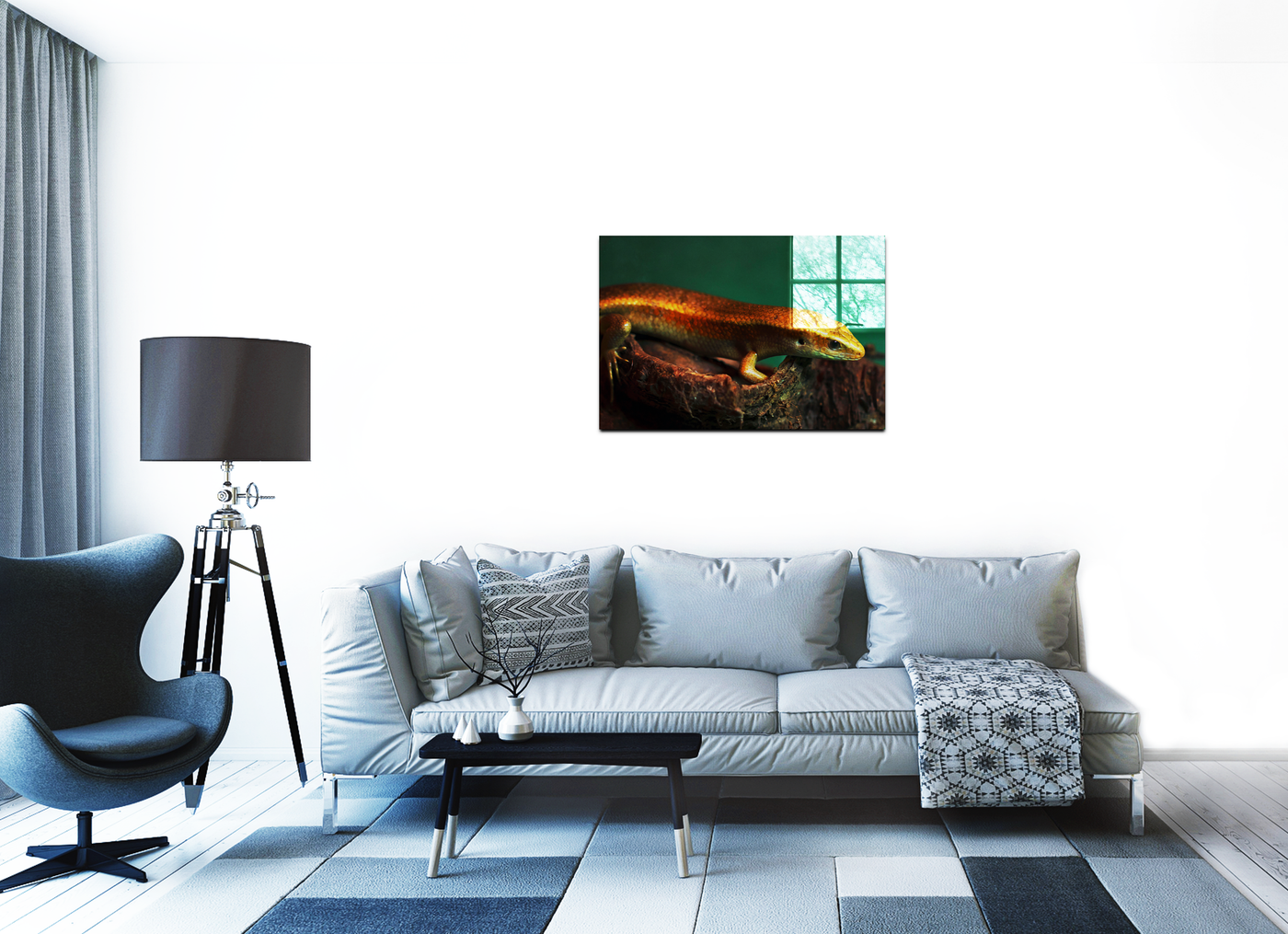 This gorgeous gold and green Acrylic print of a skink, features a reptile with a dark green background. The orange hues on the reptiles skin contrast with the greens to make this the perfect piece for anyone who loves exotic animals or, alternatively, anyone who is looking for a subtle splash of colour in their room.