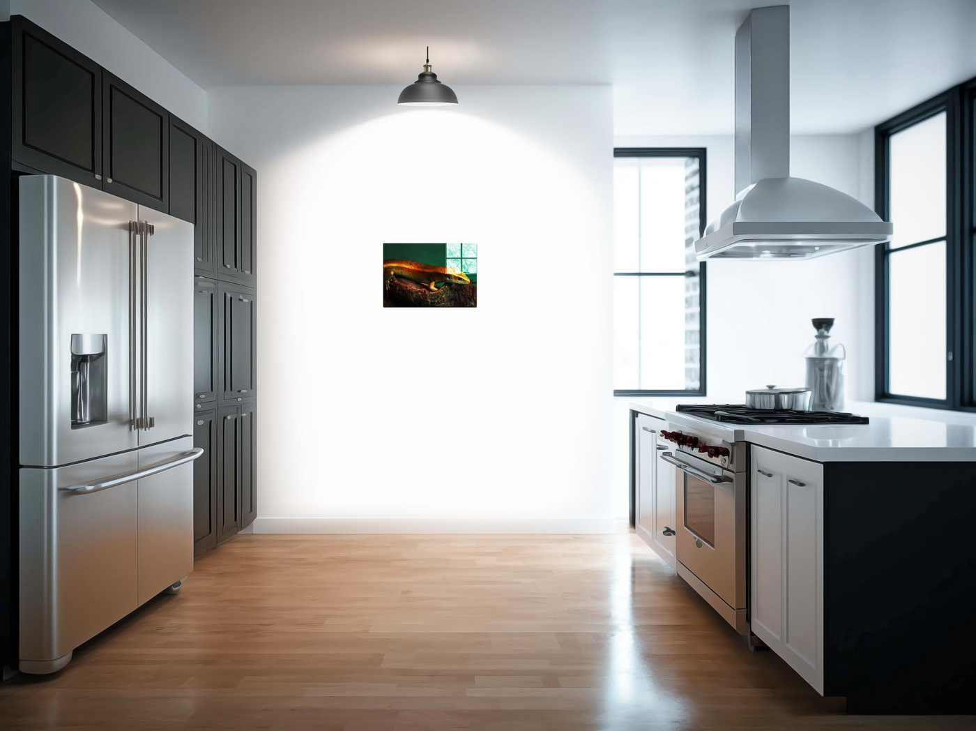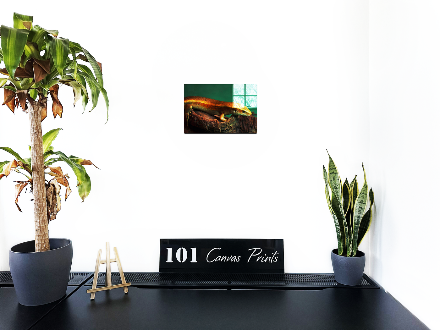 The golden skink climbing on a piece of driftwood against a rich dark background creates an opulent, sturdy effect. Built with a lustrous gold and olive green palette, this Acrylic print helps you create a relaxing ambiance in any room.