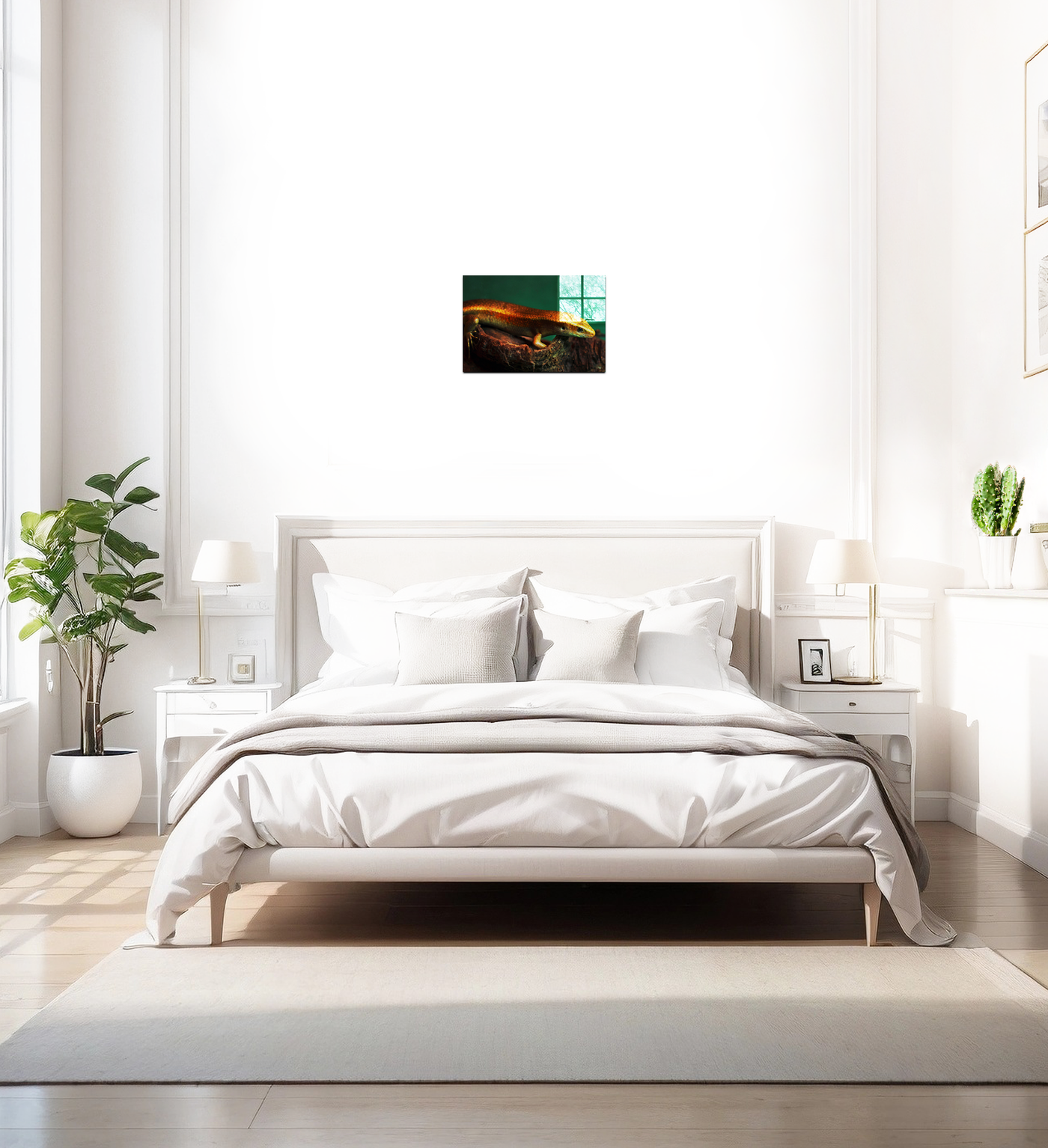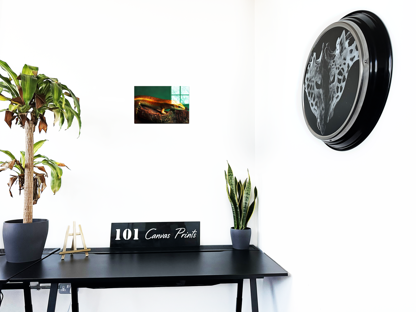 This gorgeous gold and green Acrylic print of a skink, features a reptile with a dark green background. The orange hues on the reptiles skin contrast with the greens to make this the perfect piece for anyone who loves exotic animals or, alternatively, anyone who is looking for a subtle splash of colour in their room.