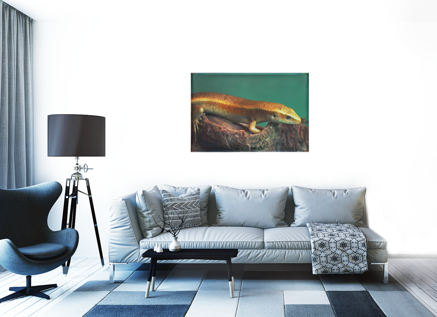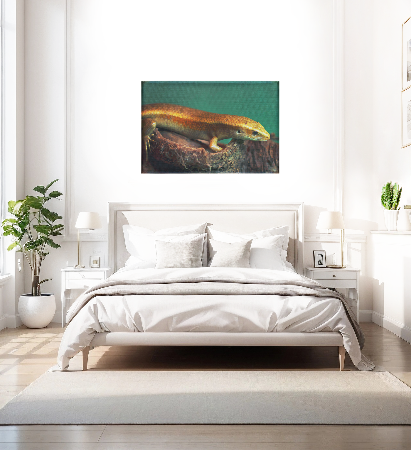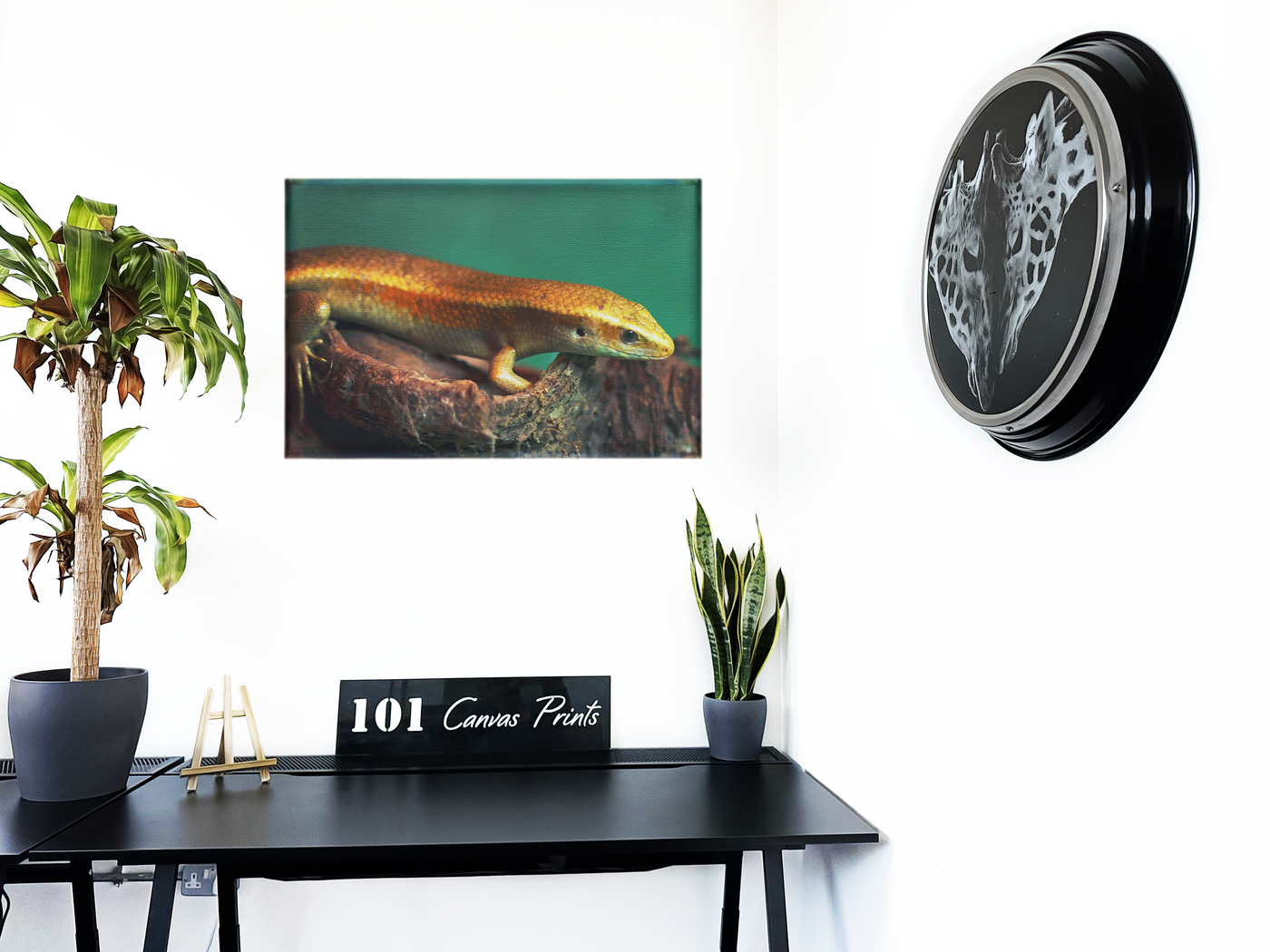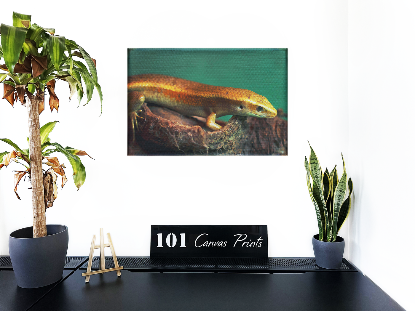 The golden skink climbing on a piece of driftwood against a rich dark background creates an opulent, sturdy effect. Built with a lustrous gold and olive green palette, this Canvas print helps you create a relaxing ambiance in any room.