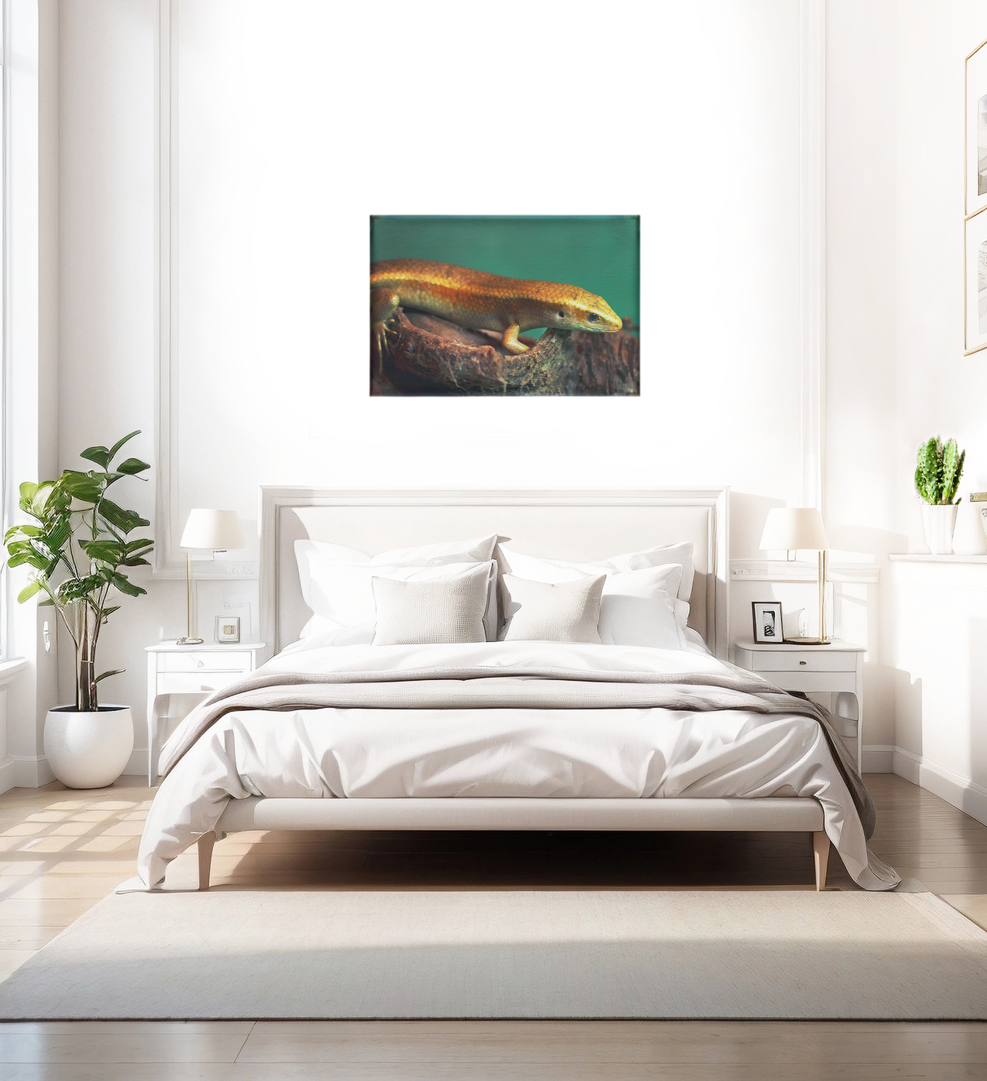 The golden skink climbing on a piece of driftwood against a rich dark background creates an opulent, sturdy effect. Built with a lustrous gold and olive green palette, this Canvas print helps you create a relaxing ambiance in any room.
