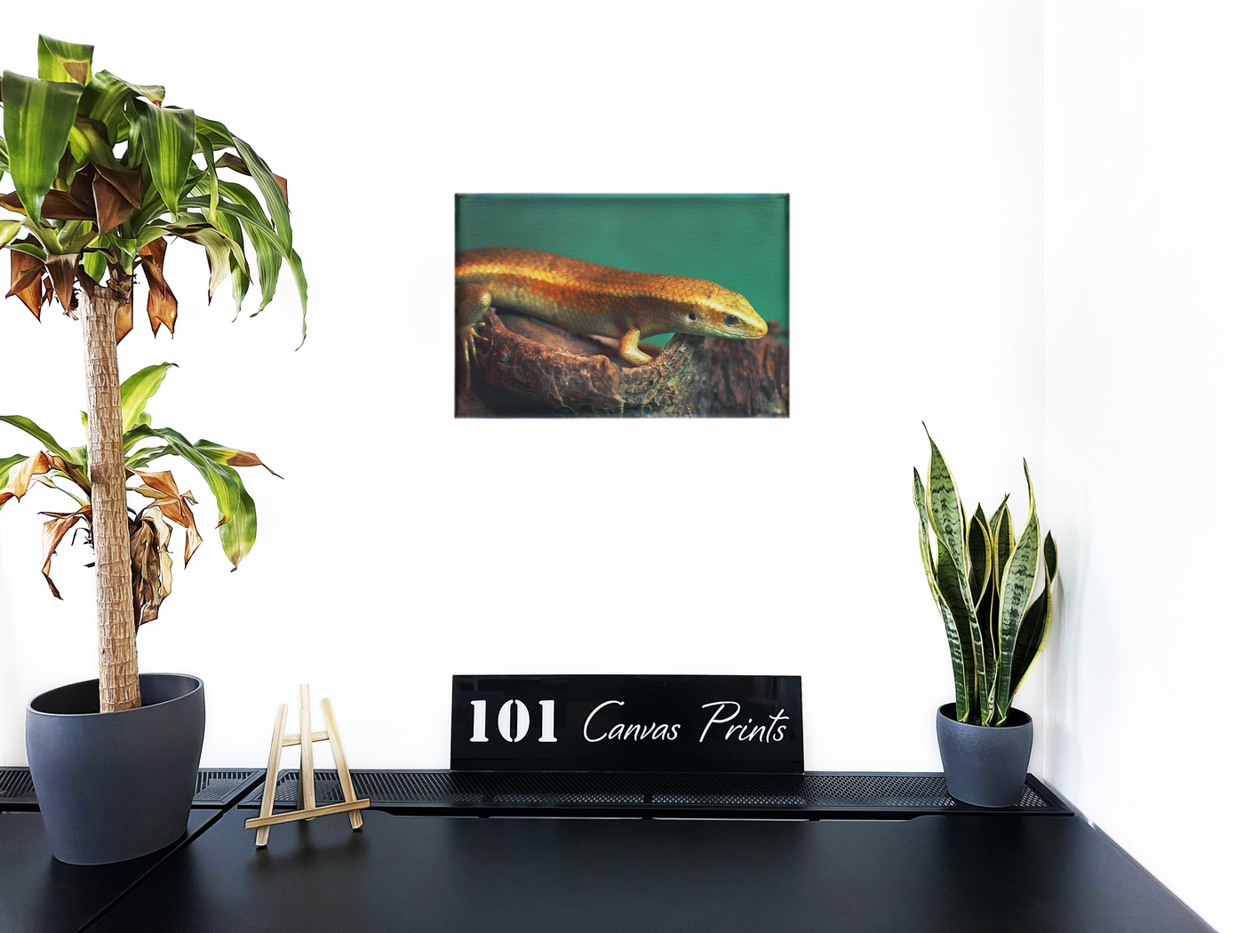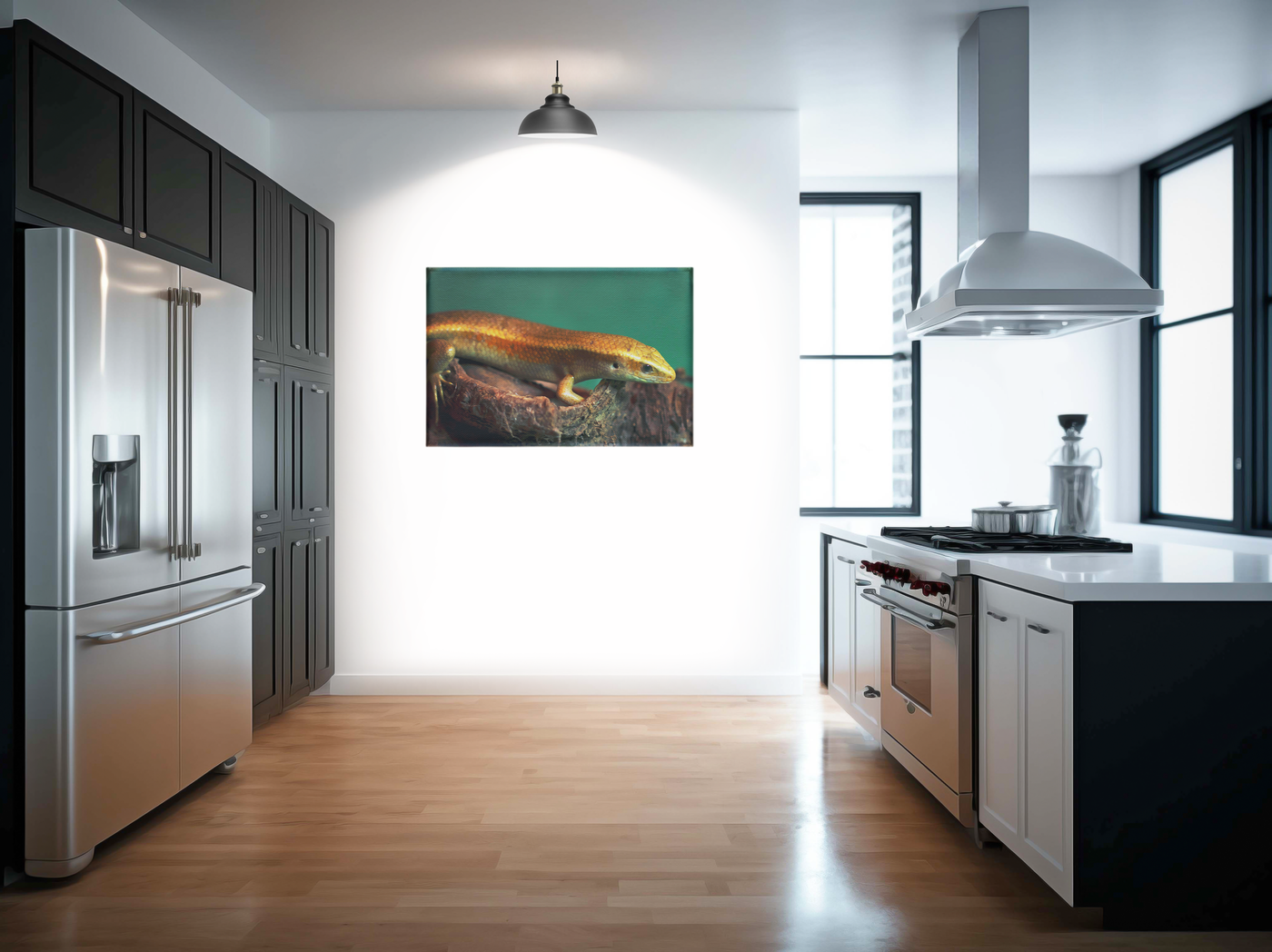 This gorgeous gold and green Canvas print of a skink, features a reptile with a dark green background. The orange hues on the reptiles skin contrast with the greens to make this the perfect piece for anyone who loves exotic animals or, alternatively, anyone who is looking for a subtle splash of colour in their room.