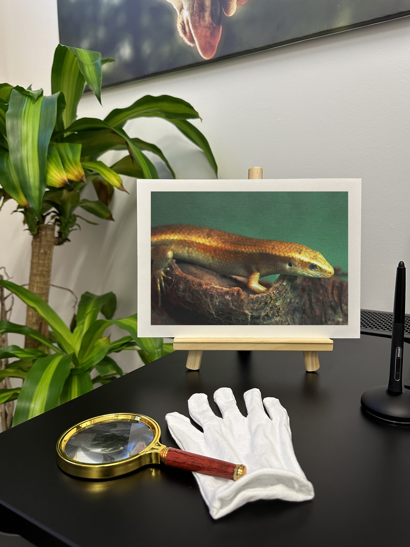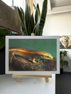 This gorgeous gold and green Fine Art print of a skink, features a reptile with a dark green background. The orange hues on the reptiles skin contrast with the greens to make this the perfect piece for anyone who loves exotic animals or, alternatively, anyone who is looking for a subtle splash of colour in their room.