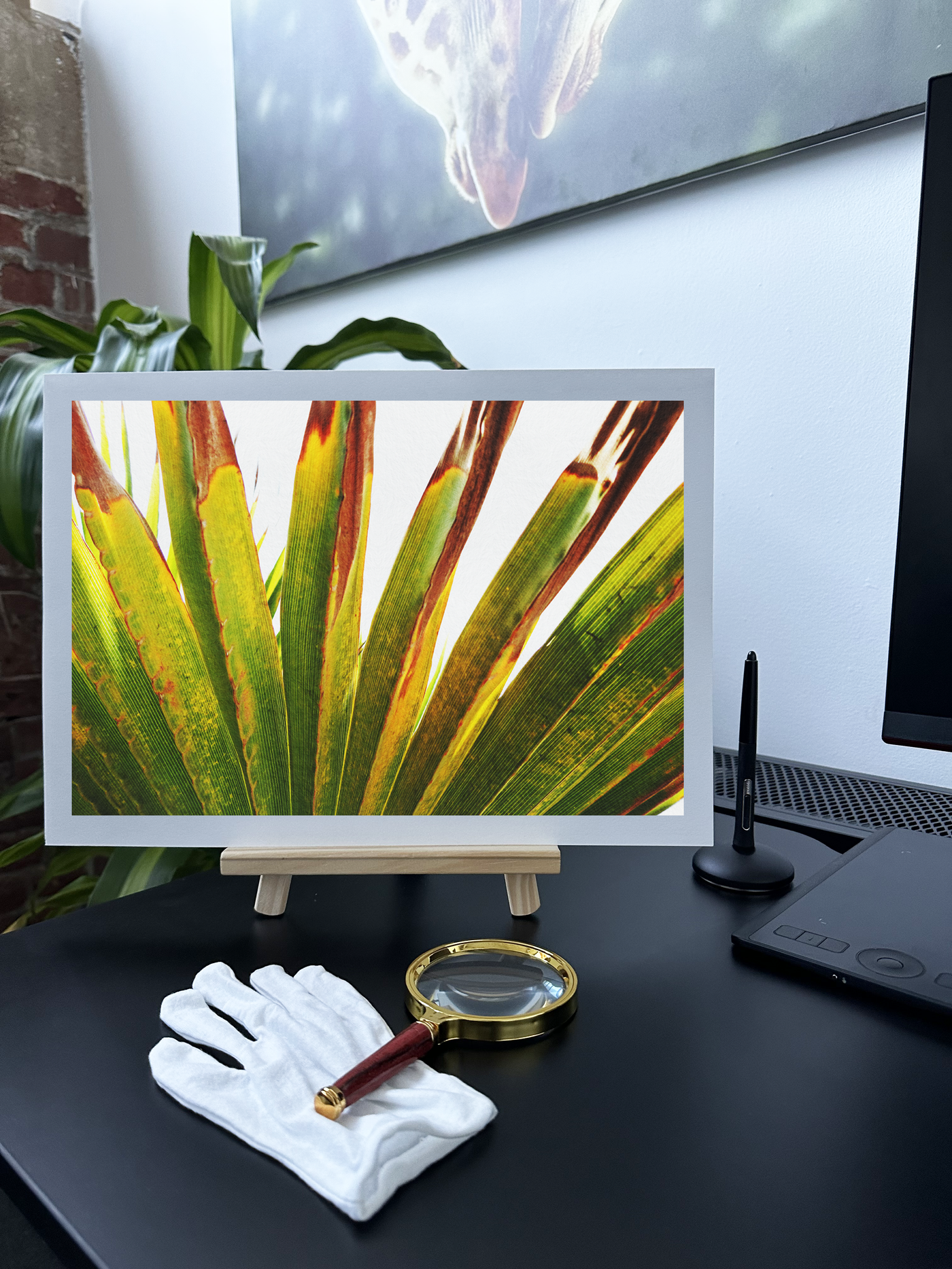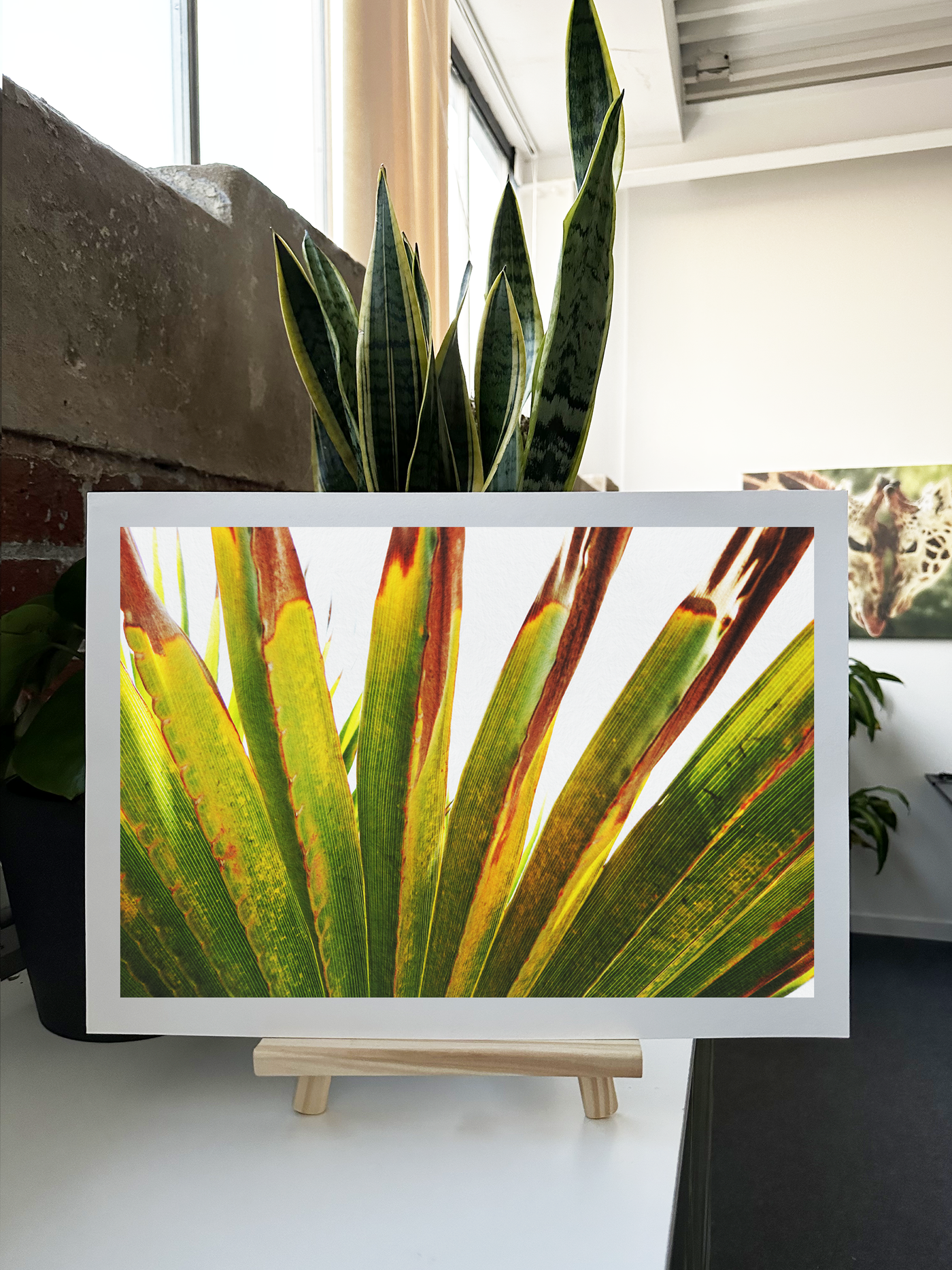 Rendered on Fine Art print paper, this image takes on a tactile quality that perfectly complements the natural subject matter. The slightly textured surface of the Fine Art print paper enhances the organic feel of the leaves, while the matte finish softens the light, creating a soothing visual experience. This print would be an excellent addition to a living room, bedroom, or any space where a touch of tropical warmth is desired. The Fine Art print medium allows the vibrant greens to appear rich yet subtle, making it a versatile piece that can energise a room without overwhelming other design elements.