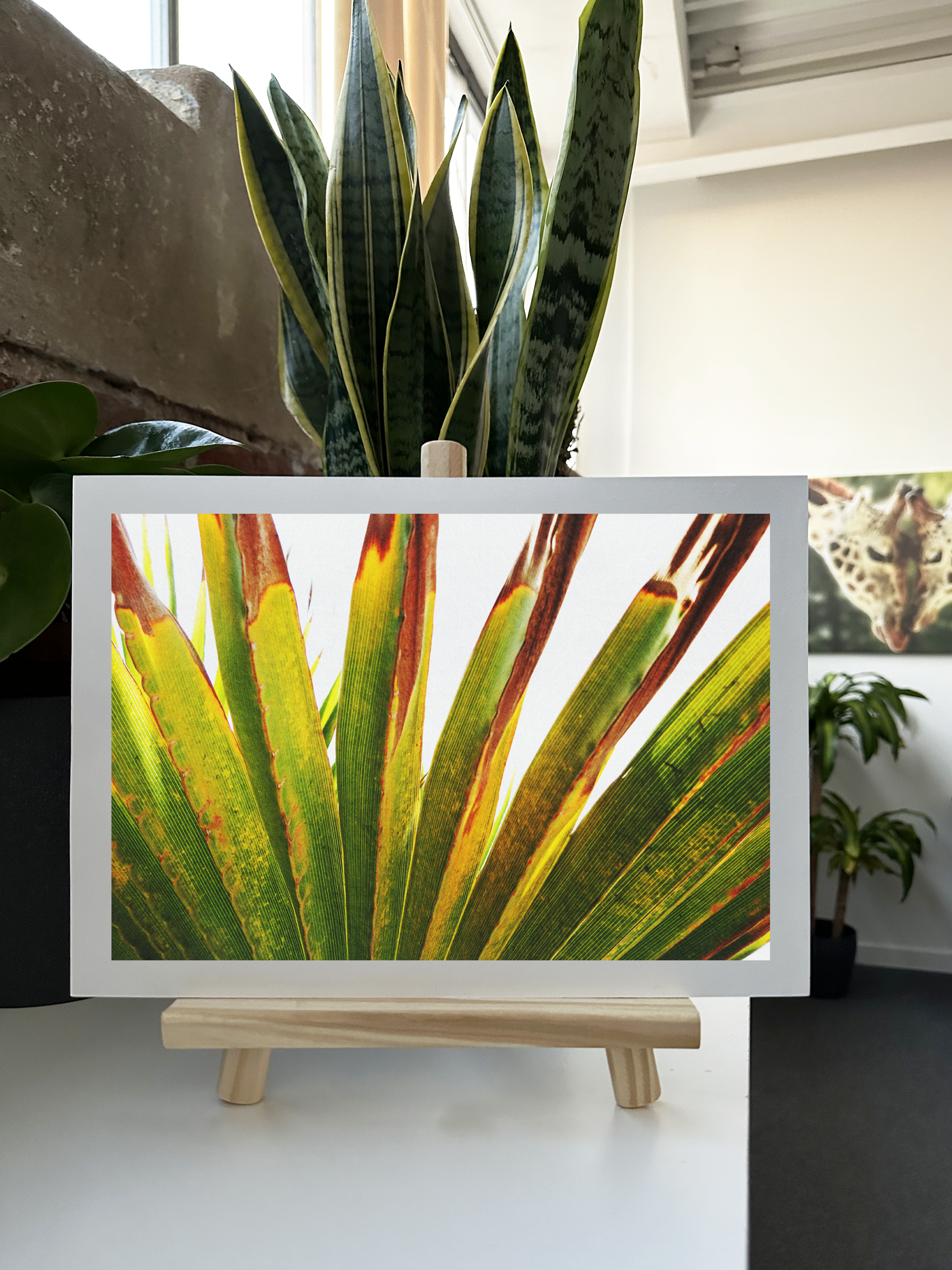 Rendered on Fine Art print paper, this image takes on a tactile quality that perfectly complements the natural subject matter. The slightly textured surface of the Fine Art print paper enhances the organic feel of the leaves, while the matte finish softens the light, creating a soothing visual experience. This print would be an excellent addition to a living room, bedroom, or any space where a touch of tropical warmth is desired. The Fine Art print medium allows the vibrant greens to appear rich yet subtle, making it a versatile piece that can energise a room without overwhelming other design elements.