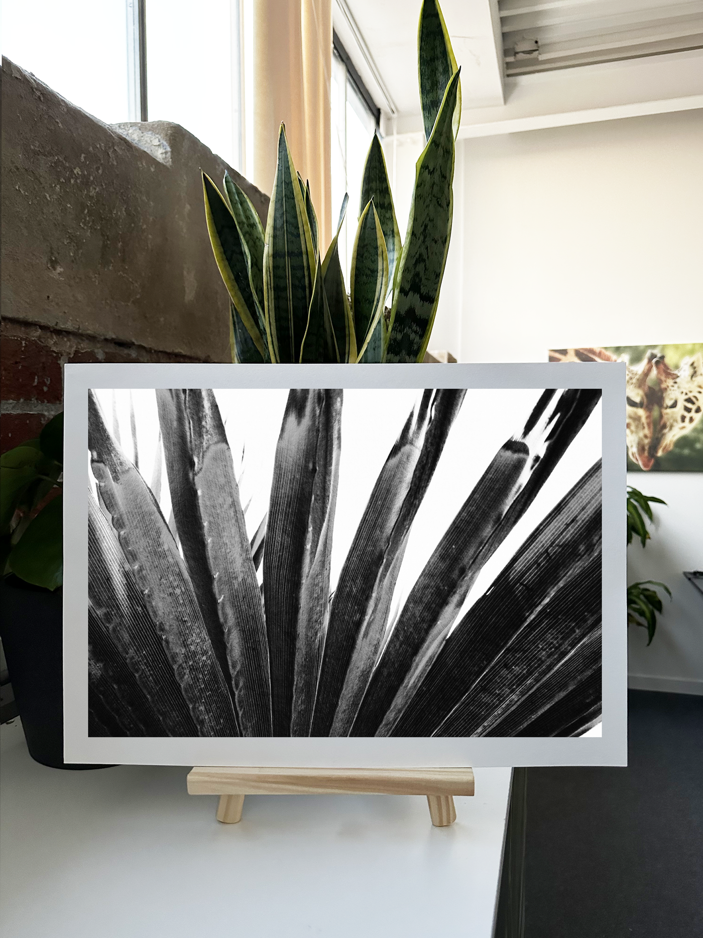 Rendered on Fine Art print paper, this image takes on a tactile quality that perfectly complements the natural subject matter. The slightly textured surface of the Fine Art print paper enhances the organic feel of the leaves, while the matte finish softens the light, creating a soothing visual experience. This print would be an excellent addition to a living room, bedroom, or any space where a touch of tropical warmth is desired. The Fine Art print medium allows the vibrant silver tones to appear rich yet subtle, making it a versatile piece that can energise a room without overwhelming other design elements.