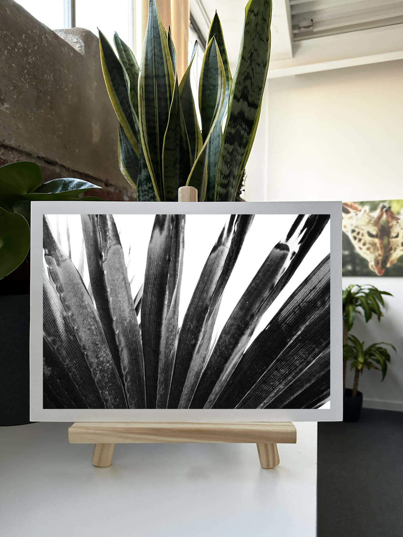 Rendered on Fine Art print paper, this image takes on a tactile quality that perfectly complements the natural subject matter. The slightly textured surface of the Fine Art print paper enhances the organic feel of the leaves, while the matte finish softens the light, creating a soothing visual experience. This print would be an excellent addition to a living room, bedroom, or any space where a touch of tropical warmth is desired. The Fine Art print medium allows the vibrant silver tones to appear rich yet subtle, making it a versatile piece that can energise a room without overwhelming other design elements.