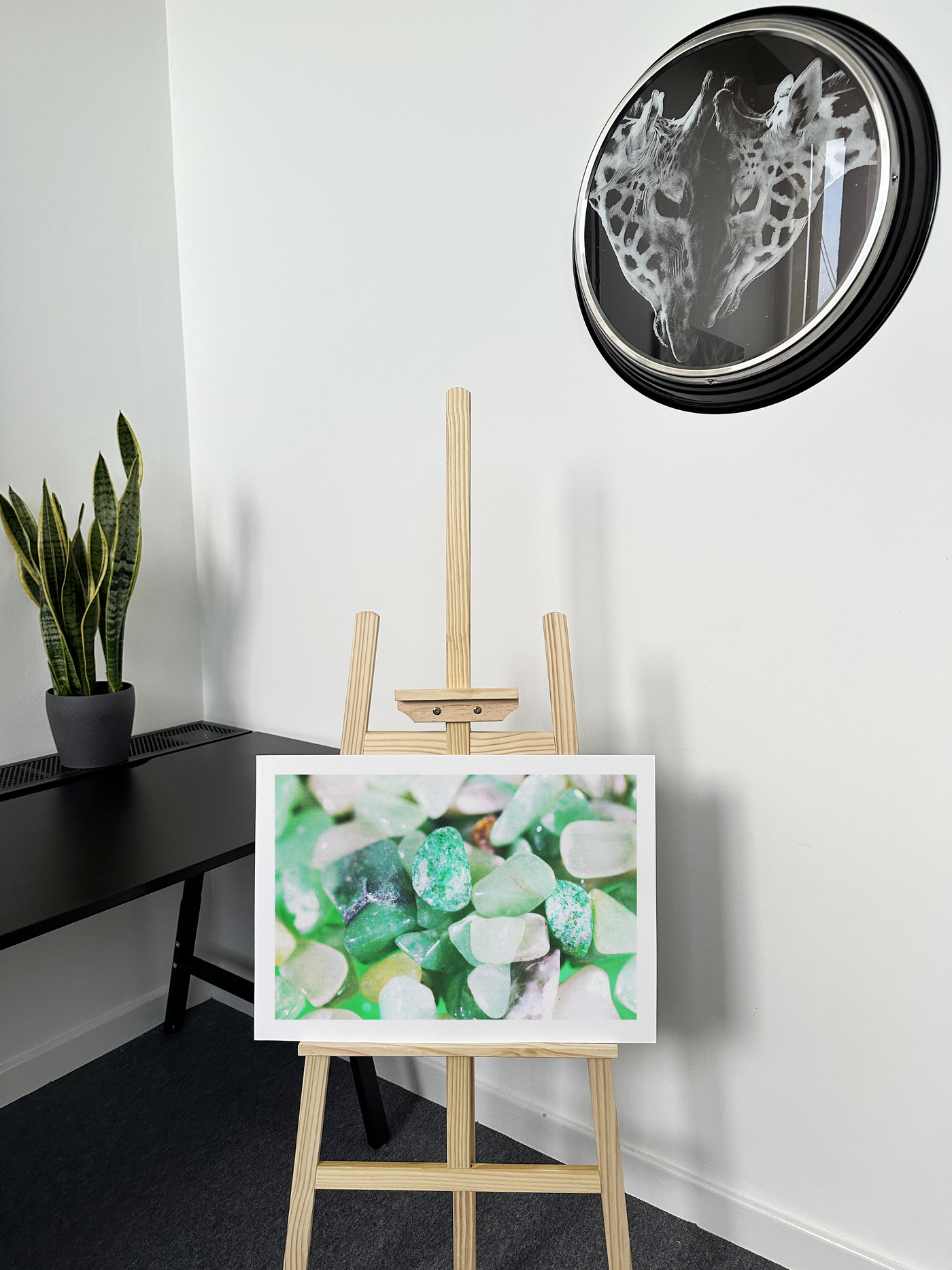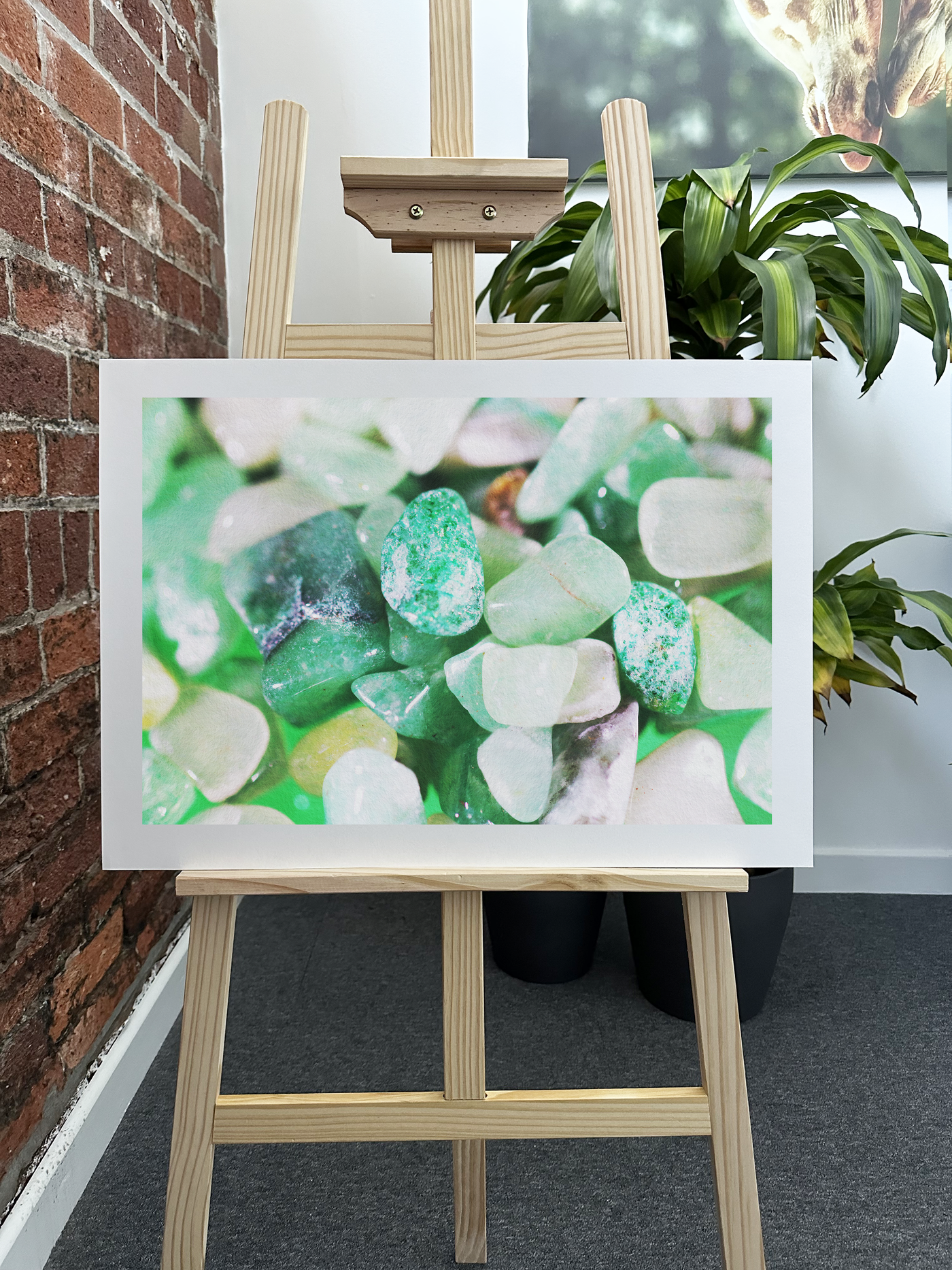 On Fine Art paper, this image takes on an additional layer of texture that complements the weathered surface of the sea glass. The matte finish of the Fine Art paper softens the overall look, enhancing the dreamy, beachcomber aesthetic. This Fine Art print would be perfect for a bathroom, bedroom, or any space where a touch of coastal tranquillity is desired. The Fine Art paper medium allows the subtle variations in colour and texture to shine through, creating a piece that is both visually interesting and deeply calming.