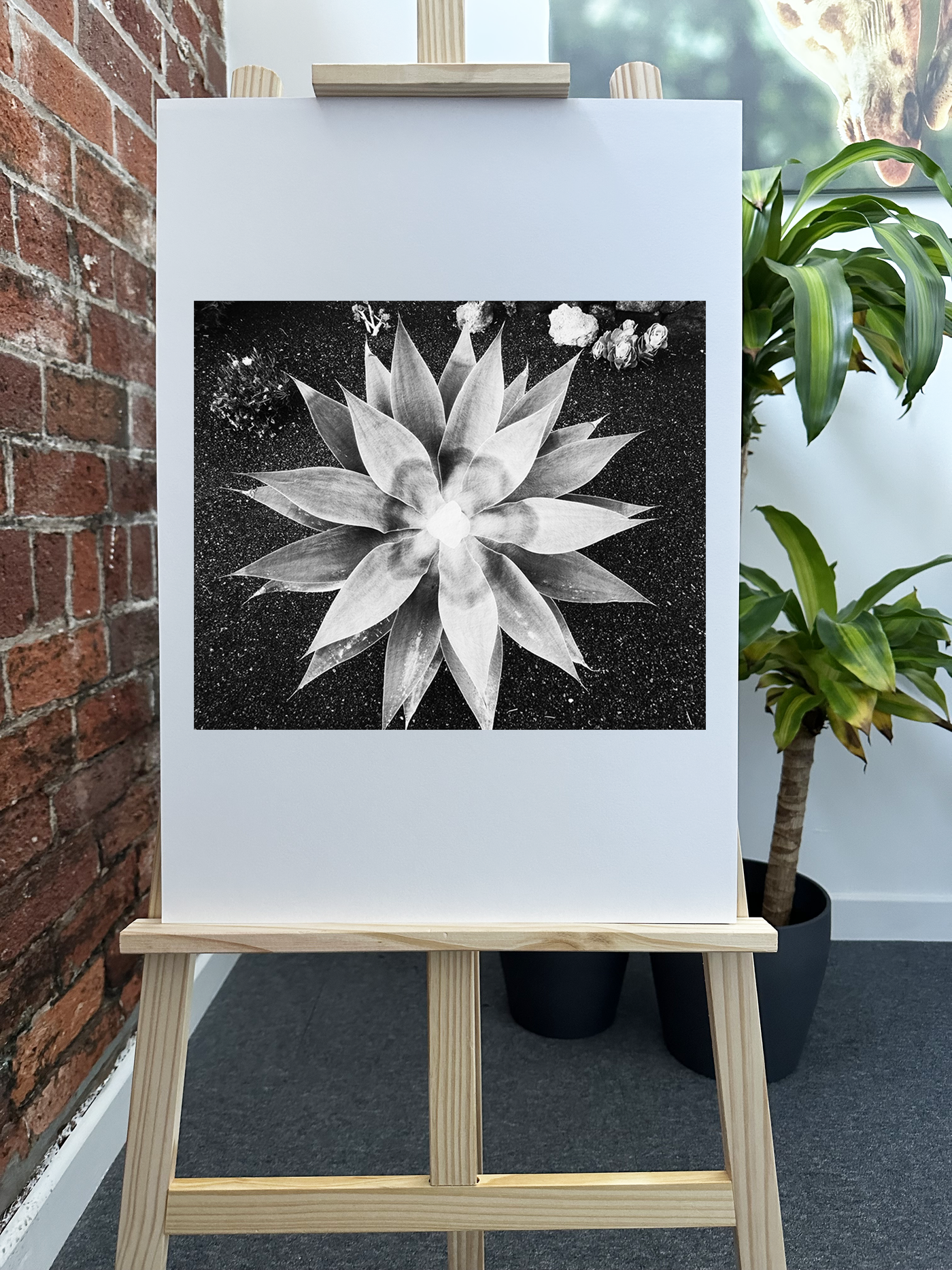 Printed on Fine Art paper, this image takes on a new dimension of natural beauty. The matte finish of the Fine Art paper softens the succulent's sharp edges, creating a harmonious blend with the textured background. The Fine Art paper texture subtly mimics the grainy texture of the soil, enhancing the organic feel of the piece. This print would be a stunning focal point in a modern living room, adding a touch of natural geometry to the space. It would also be well-suited to a home office or meditation room, where its symmetrical pattern could provide a sense of balance and tranquillity.