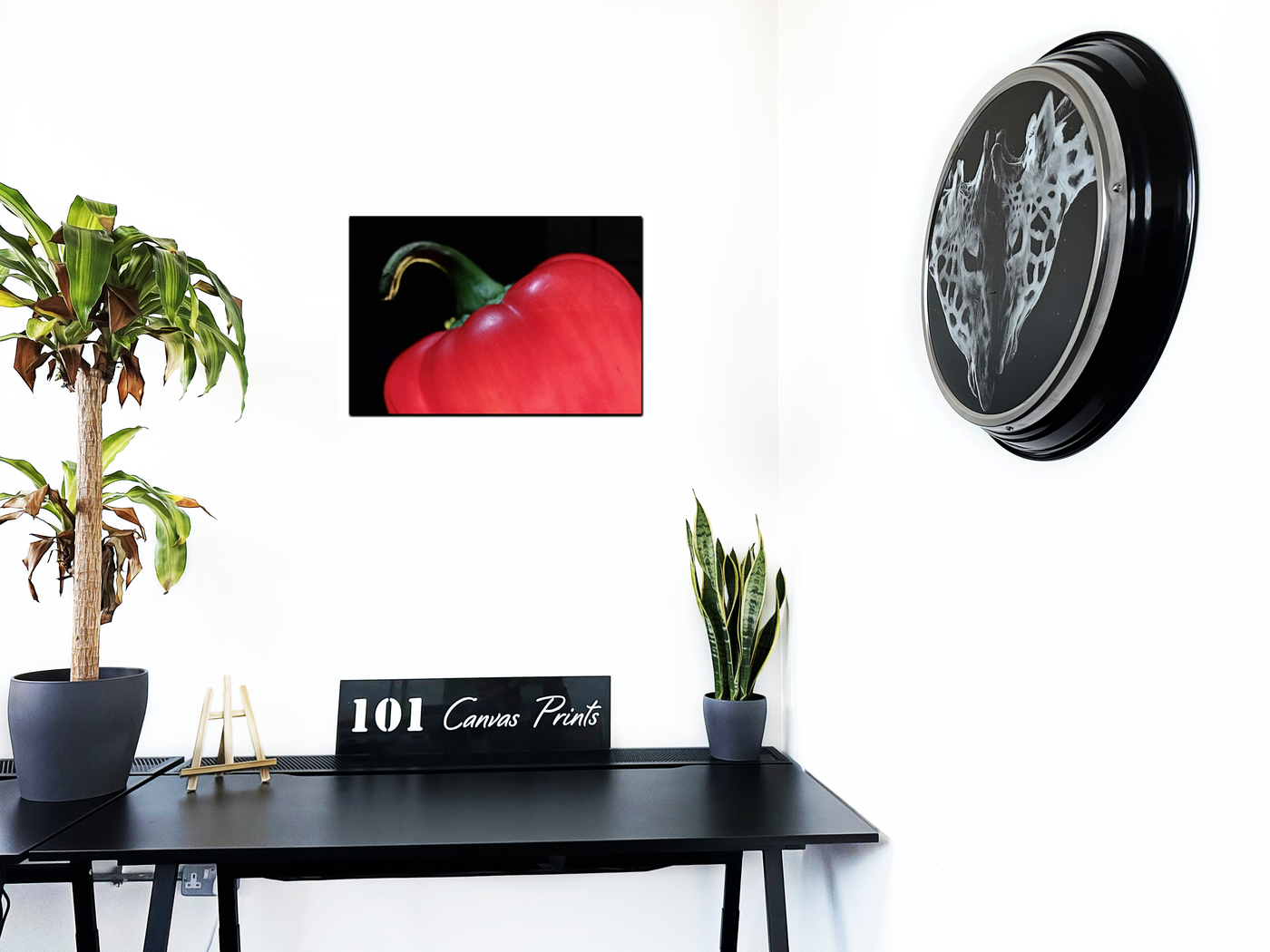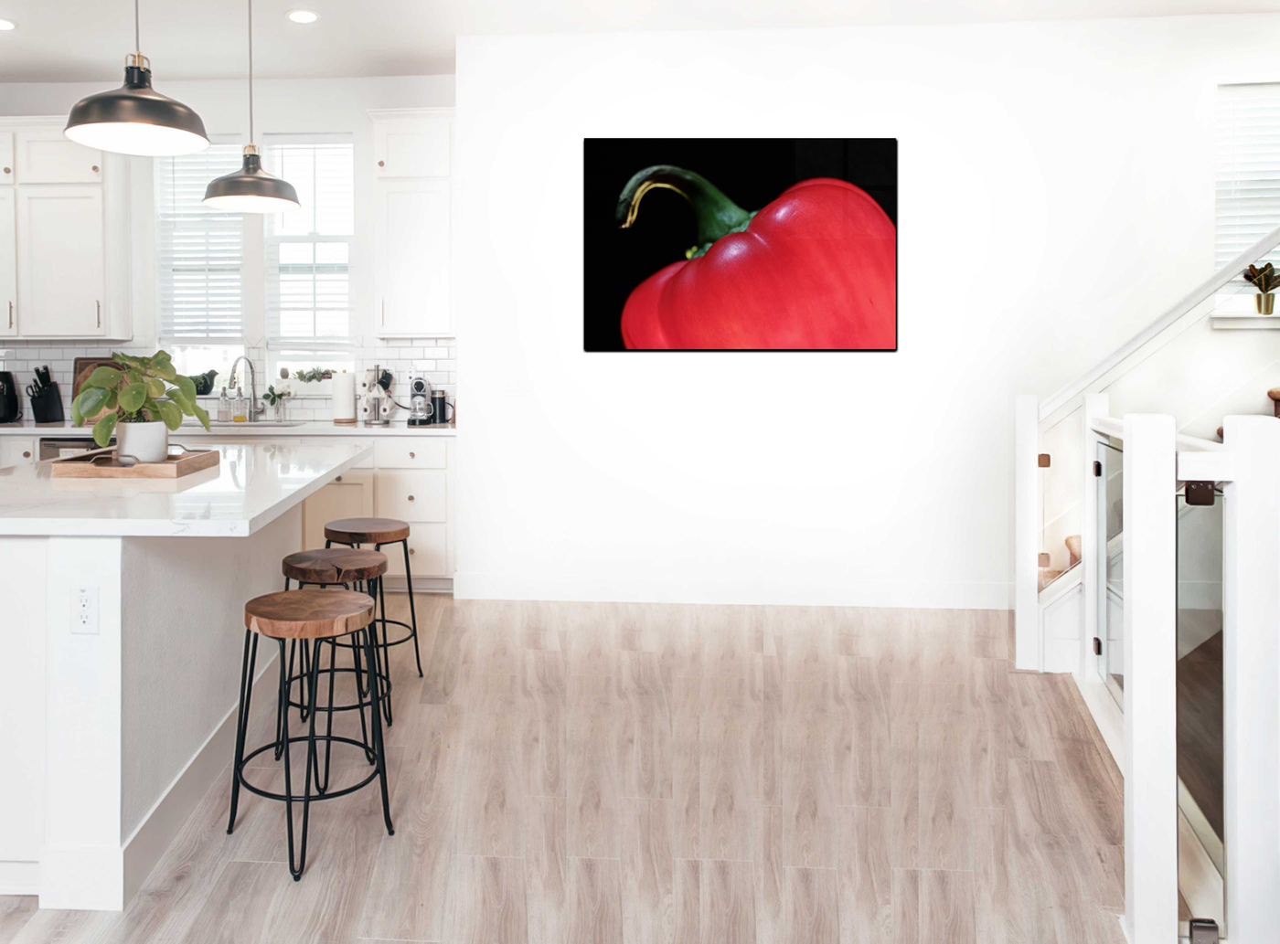 This Acrylic print would make a stunning focal point in a modern kitchen, dining room, or any space where a bold, contemporary aesthetic is desired. The glossy, vibrant finish of the acrylic-set print intensifies the already striking colour contrast, creating a piece that is both visually arresting and elegantly simple. The enhanced depth and vibrancy achieved through the Acrylic medium make the pepper appear so real and tempting that viewers might be tempted to reach out and touch it.