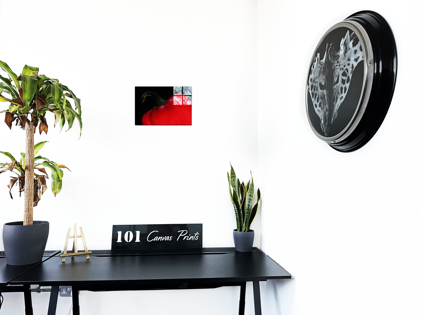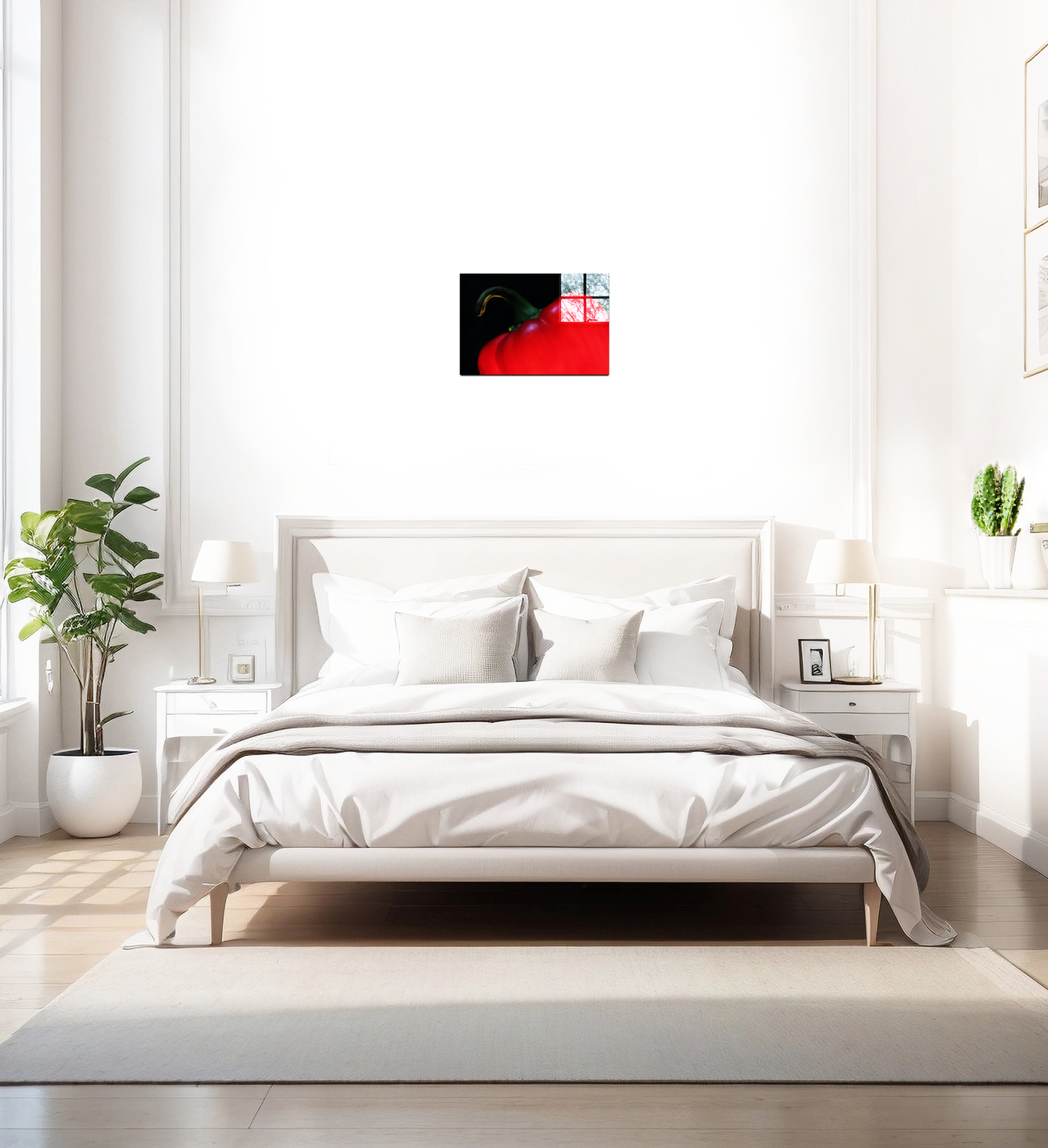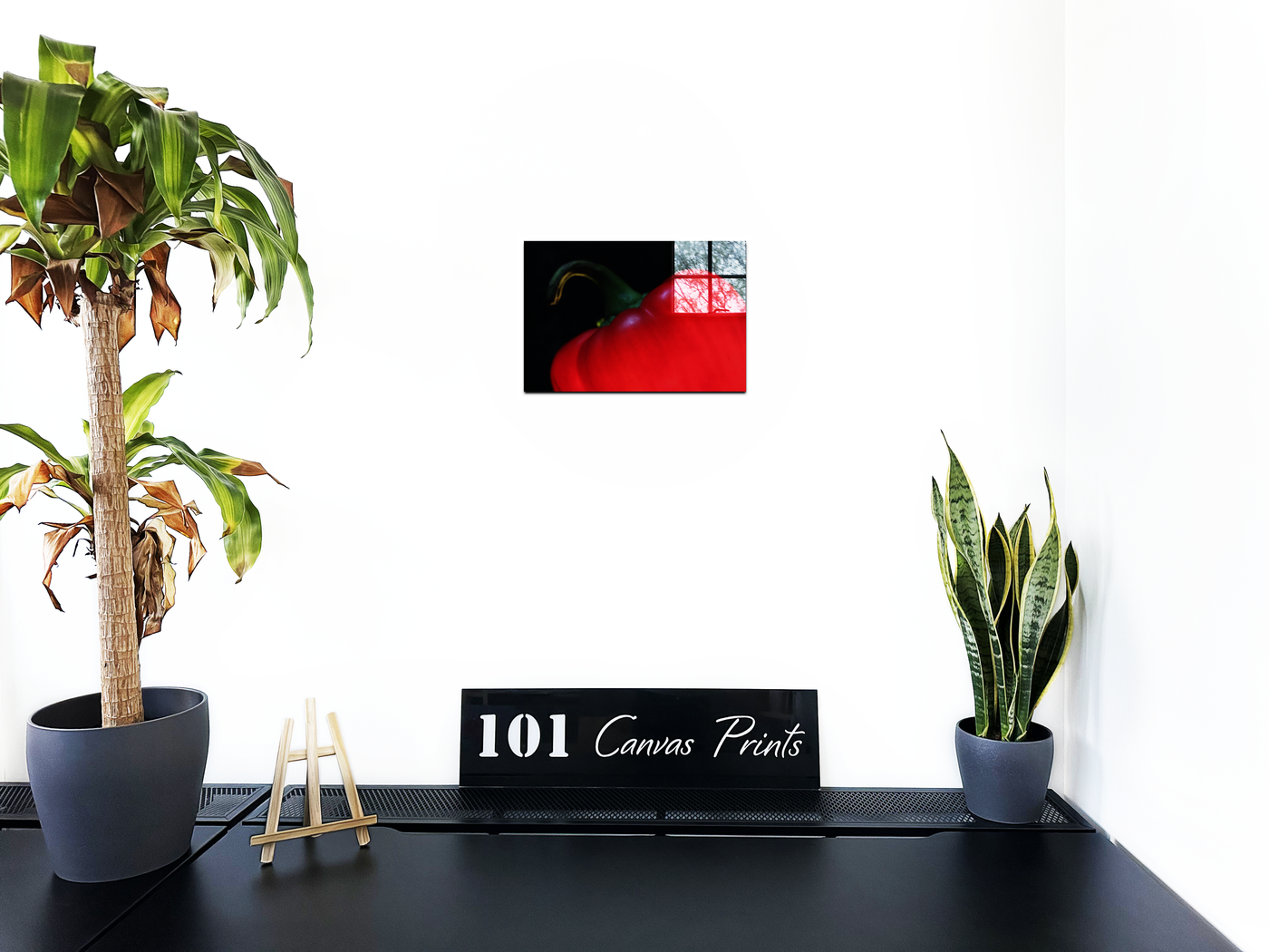 This Acrylic print would make a stunning focal point in a modern kitchen, dining room, or any space where a bold, contemporary aesthetic is desired. The glossy, vibrant finish of the acrylic-set print intensifies the already striking colour contrast, creating a piece that is both visually arresting and elegantly simple. The enhanced depth and vibrancy achieved through the Acrylic medium make the pepper appear so real and tempting that viewers might be tempted to reach out and touch it.