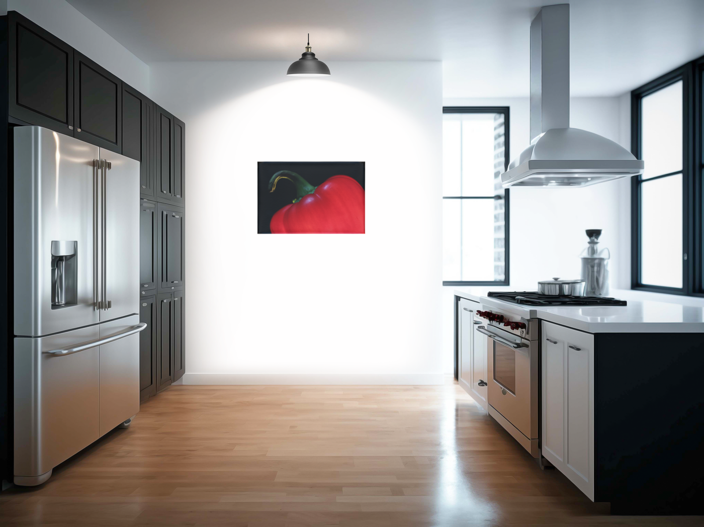 The colour palette is dominated by a rich, saturated red that practically glows against the deep black background. This stark contrast creates a dramatic, almost chiaroscuro effect, emphasising the pepper's voluptuous shape and textured skin. Subtle variations in the red tones, from bright crimson to deeper maroon, reveal the pepper's contours and bring depth to the image. The green stem adds a small but crucial accent of colour, its yellowish tip hinting at the pepper's journey from green to red.