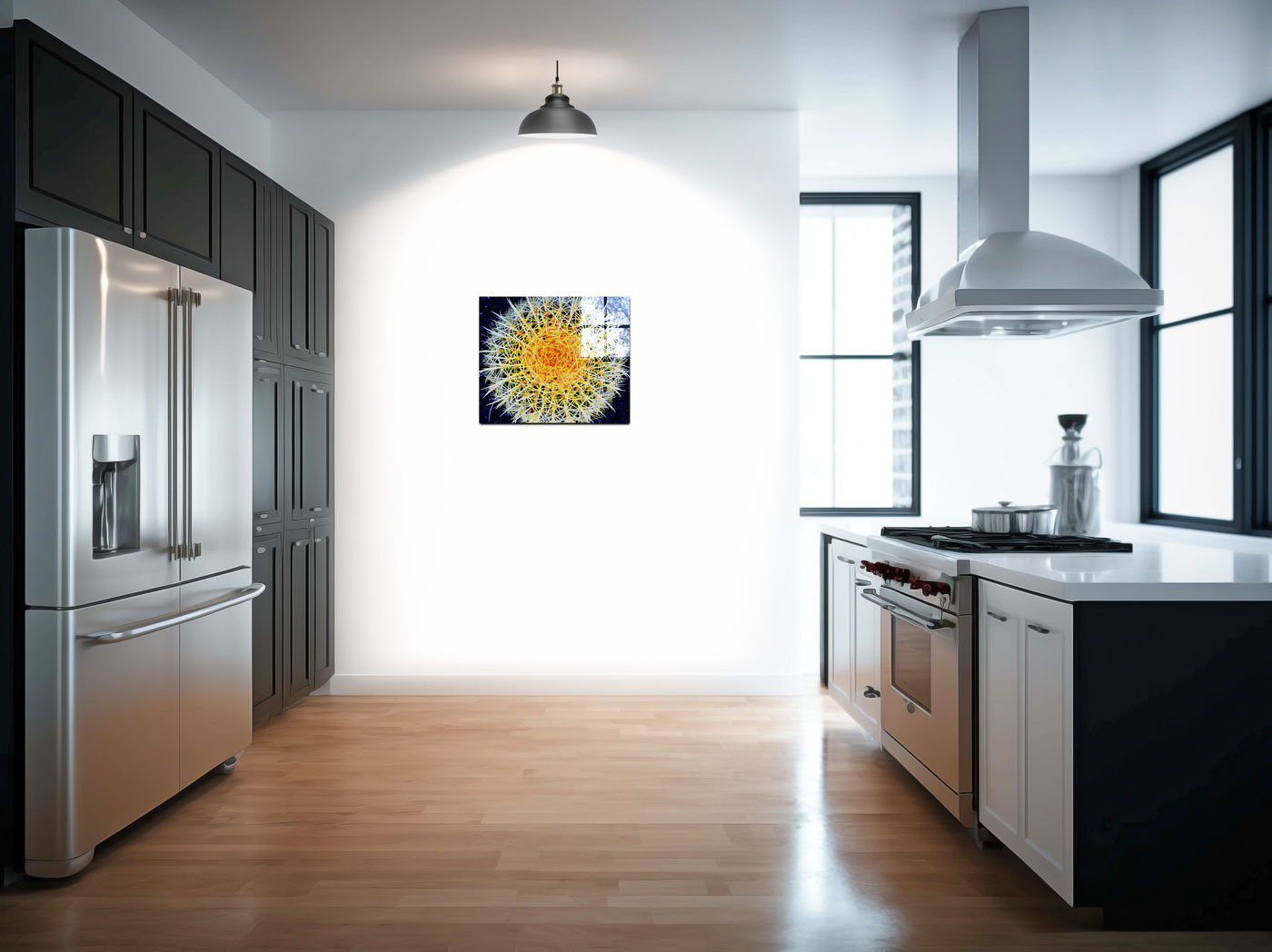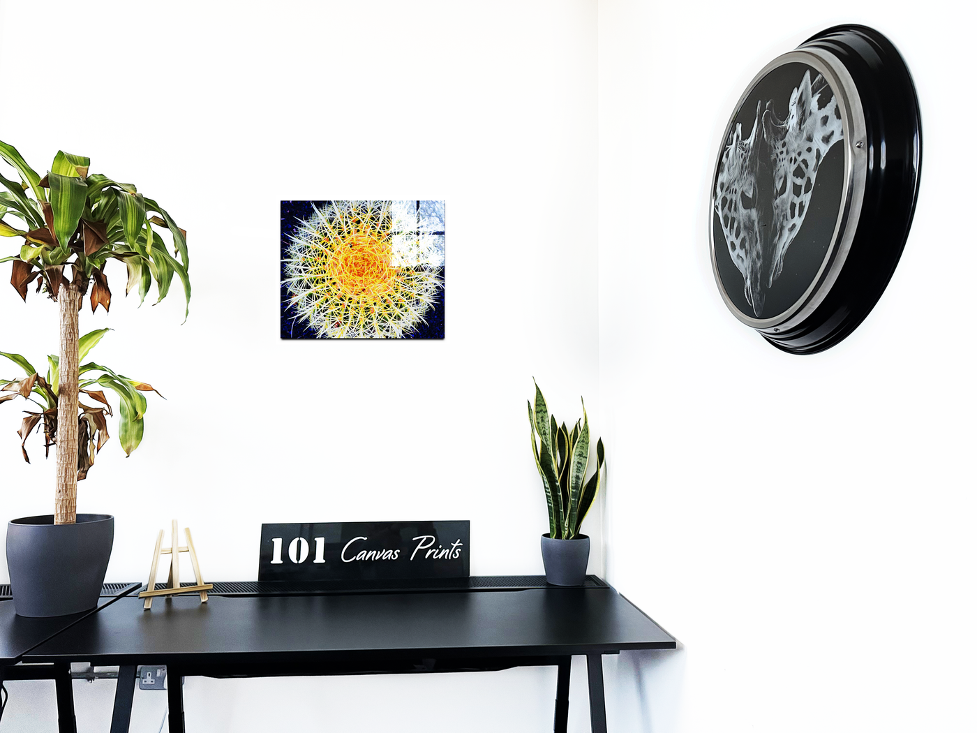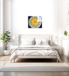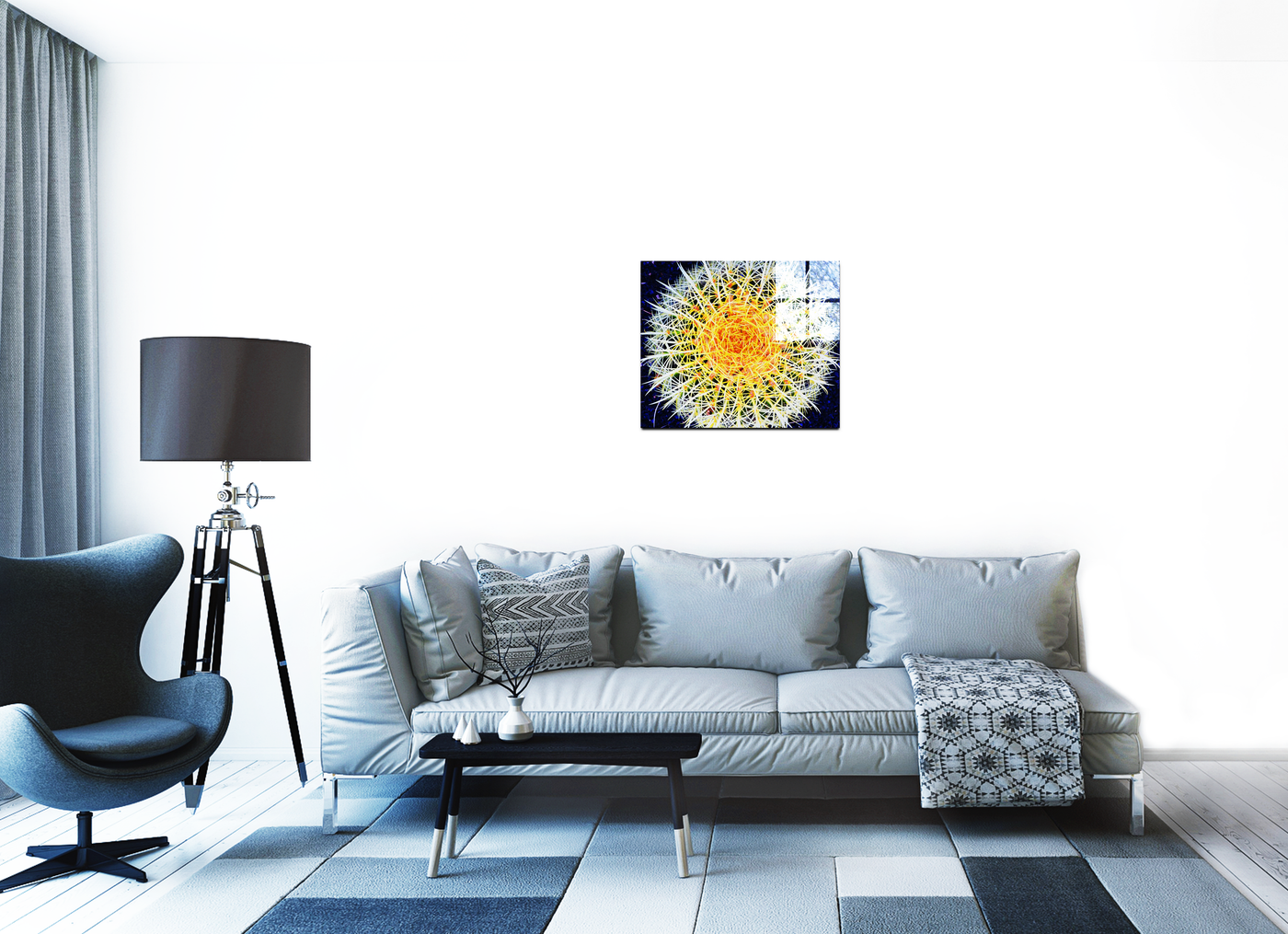 "Hot Cactus" is a Acrylic print of a photograph of a cactus taken from a birds eye view. The cactus is set against a dark blue and black background, and the colours in the cactus needles have been saturated to bring out the hot yellows and oranges of the plant, to create an otherworldly, planetary effect.