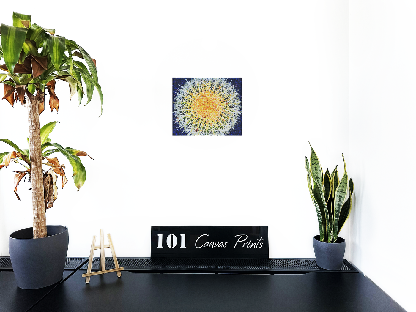 "Hot Cactus" is a Canvas print of a photograph of a cactus taken from a birds eye view. The cactus is set against a dark blue and black background, and the colours in the cactus needles have been saturated to bring out the hot yellows and oranges of the plant, to create an otherworldly, planetary effect.
