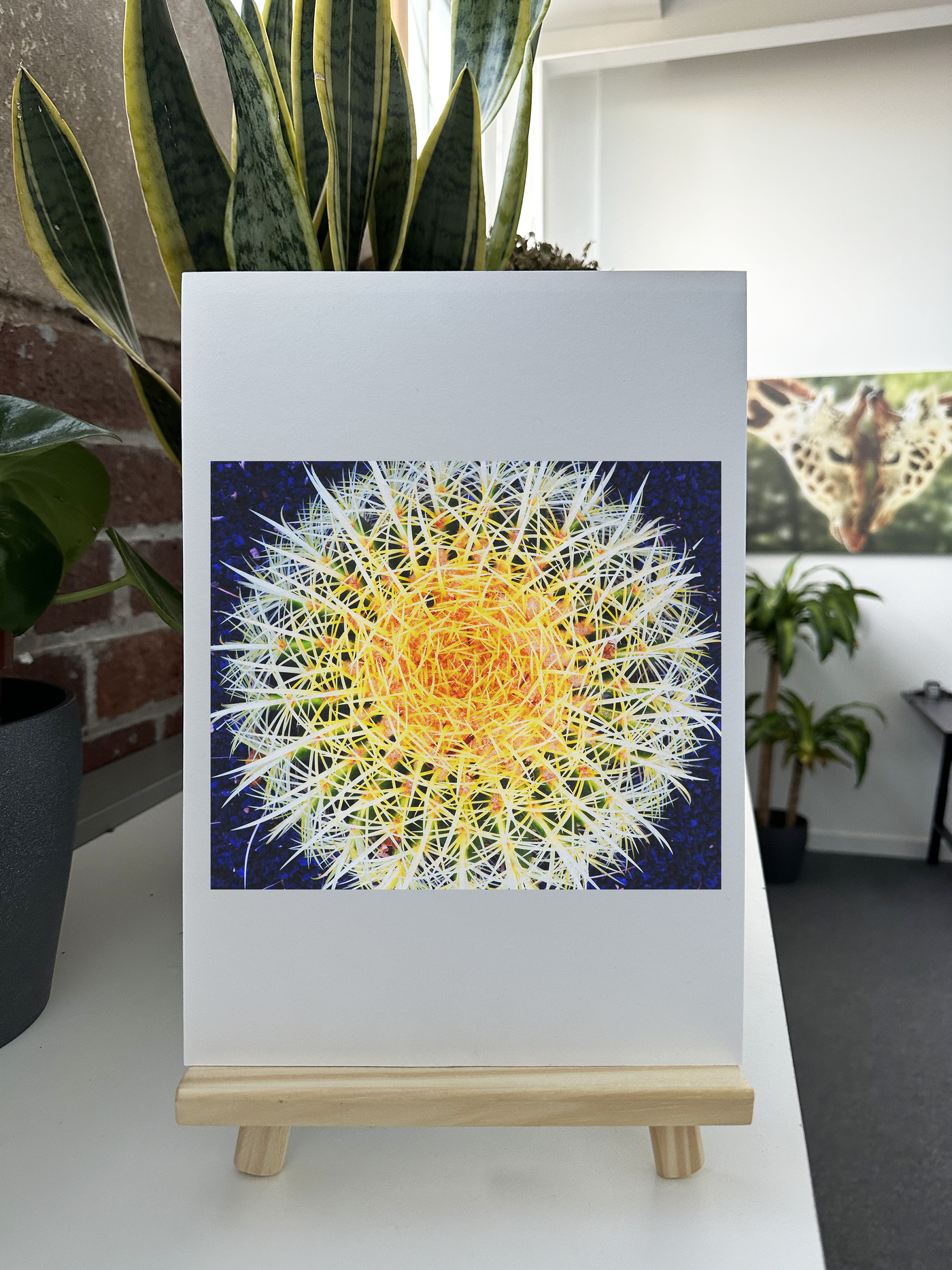 "Hot Cactus" is a Fine Art print of a photograph of a cactus taken from a birds eye view. The cactus is set against a dark blue and black background, and the colours in the cactus needles have been saturated to bring out the hot yellows and oranges of the plant, to create an otherworldly, planetary effect.