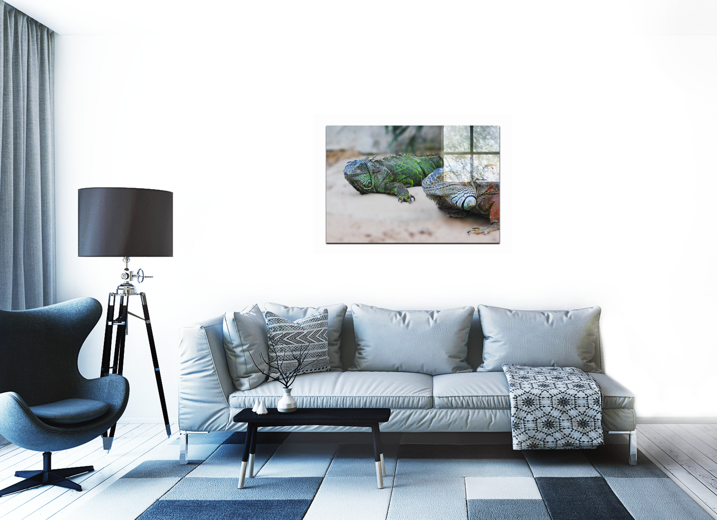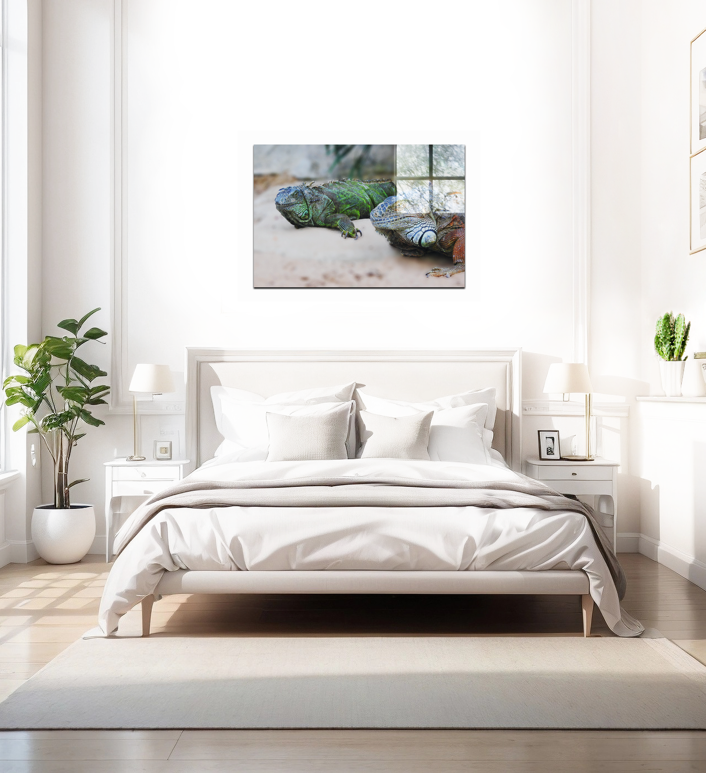 As an acrylic-set print, this image is transformed into a window-like portal to the reptilian world. The high-gloss finish of the Acrylic enhances the already lifelike quality of the photograph, making the iguanas' scales appear almost three-dimensional. The vibrancy of the colours is intensified, with the blues and greens taking on an almost jewel-like quality. The Acrylic's depth creates an illusion that the iguanas might at any moment crawl out of the frame. This piece would make a bold statement in a modern living room, its glossy surface reflecting ambient light and creating a dynamic interplay with its surroundings. Alternatively, it could serve as a striking centrepiece in a child's bedroom or playroom, sparking curiosity about the natural world and prehistoric life.