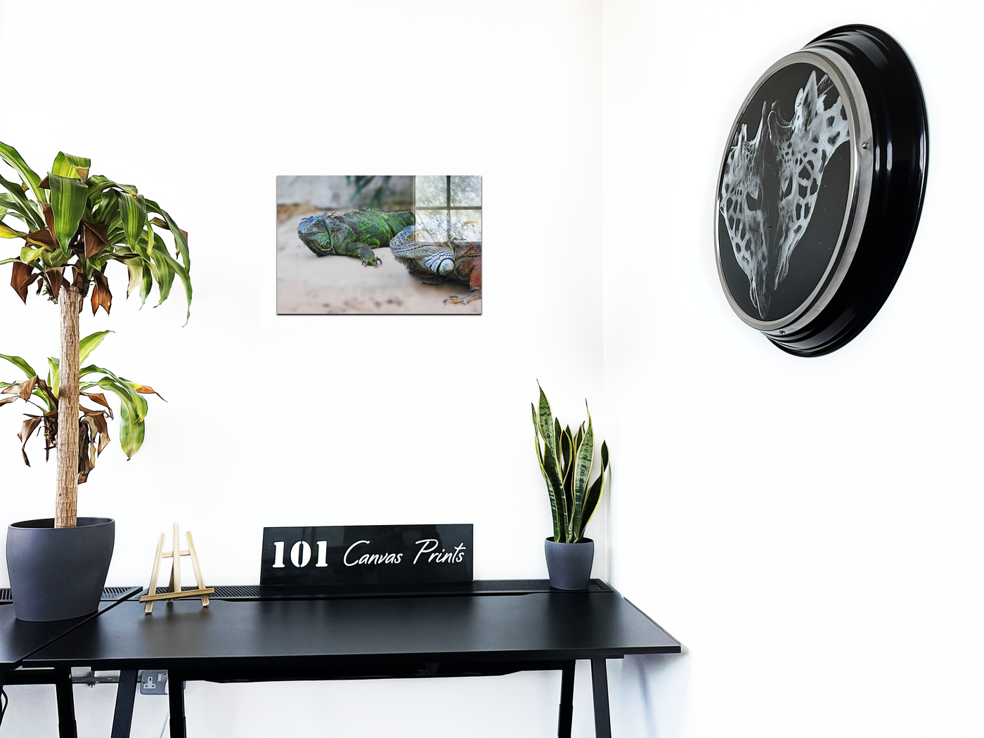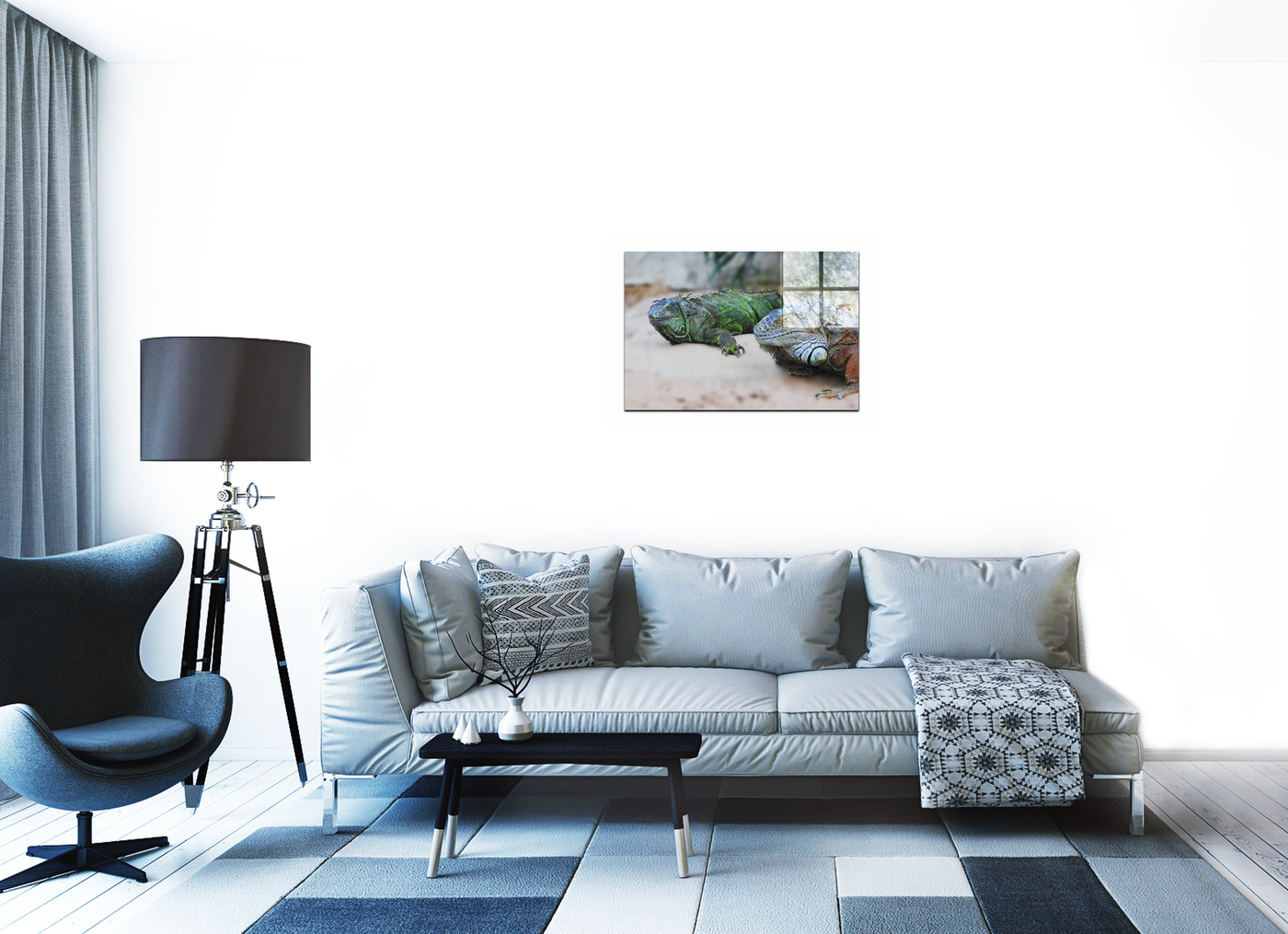 As an acrylic-set print, this image is transformed into a window-like portal to the reptilian world. The high-gloss finish of the Acrylic enhances the already lifelike quality of the photograph, making the iguanas' scales appear almost three-dimensional. The vibrancy of the colours is intensified, with the blues and greens taking on an almost jewel-like quality. The Acrylic's depth creates an illusion that the iguanas might at any moment crawl out of the frame. This piece would make a bold statement in a modern living room, its glossy surface reflecting ambient light and creating a dynamic interplay with its surroundings. Alternatively, it could serve as a striking centrepiece in a child's bedroom or playroom, sparking curiosity about the natural world and prehistoric life.