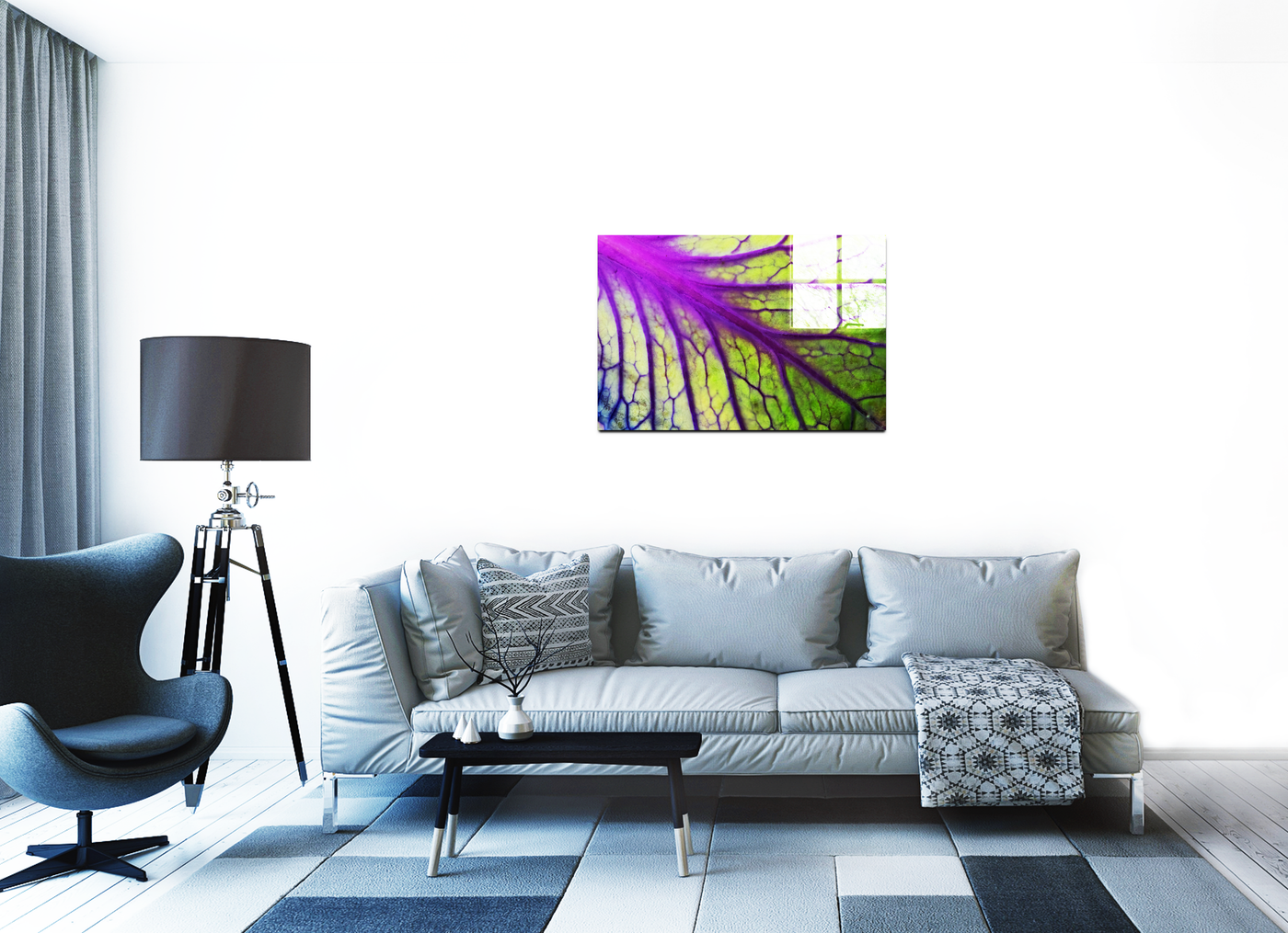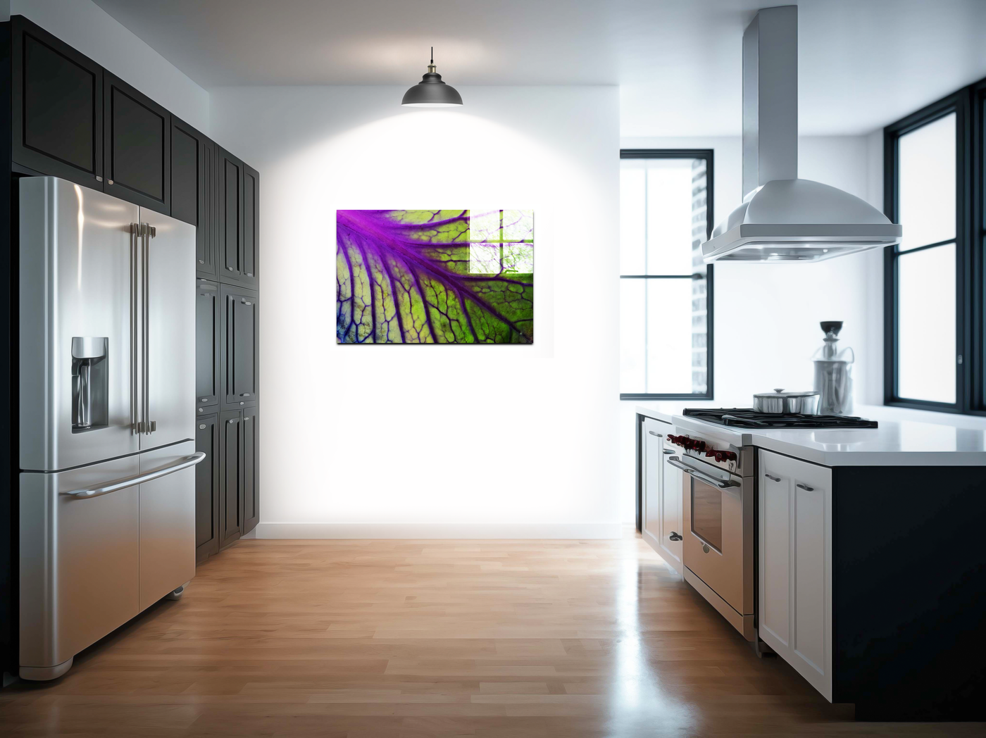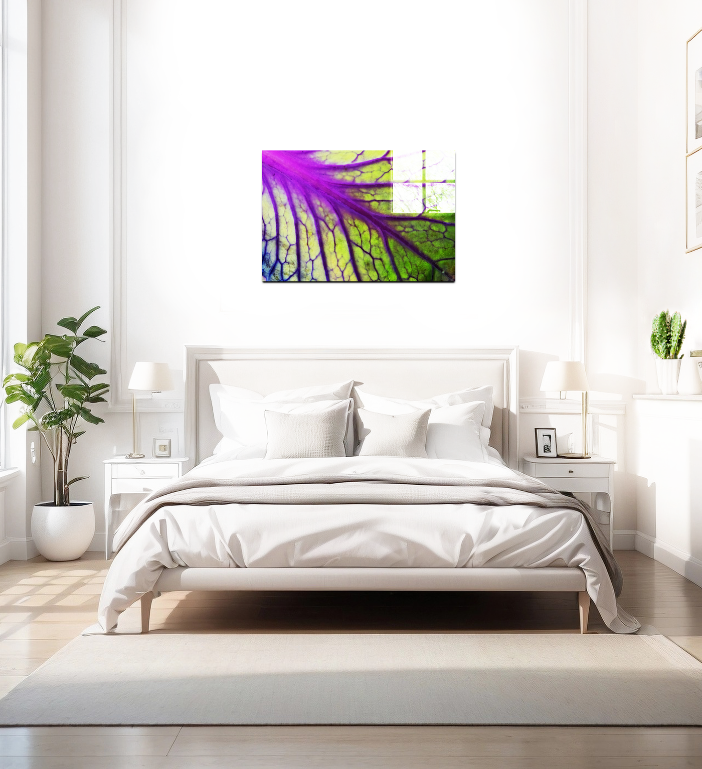 When presented in our premium Acrylic medium, this botanical masterpiece achieves an extraordinary level of visual impact. The high-gloss finish dramatically enhances the vibrancy of both the purples and greens, while the crystal-clear surface creates an almost three-dimensional effect that brings new life to the leaf's internal landscape. The way light interacts with our Acrylic prints adds an extra dimension to the viewing experience, making the leaf's structure appear to glow from within, much like it might appear when held up to natural sunlight. This stunning piece would be particularly effective in contemporary spaces where its vibrant colours and natural patterns can create maximum impact, from a modern home to a medical office or botanical institution.