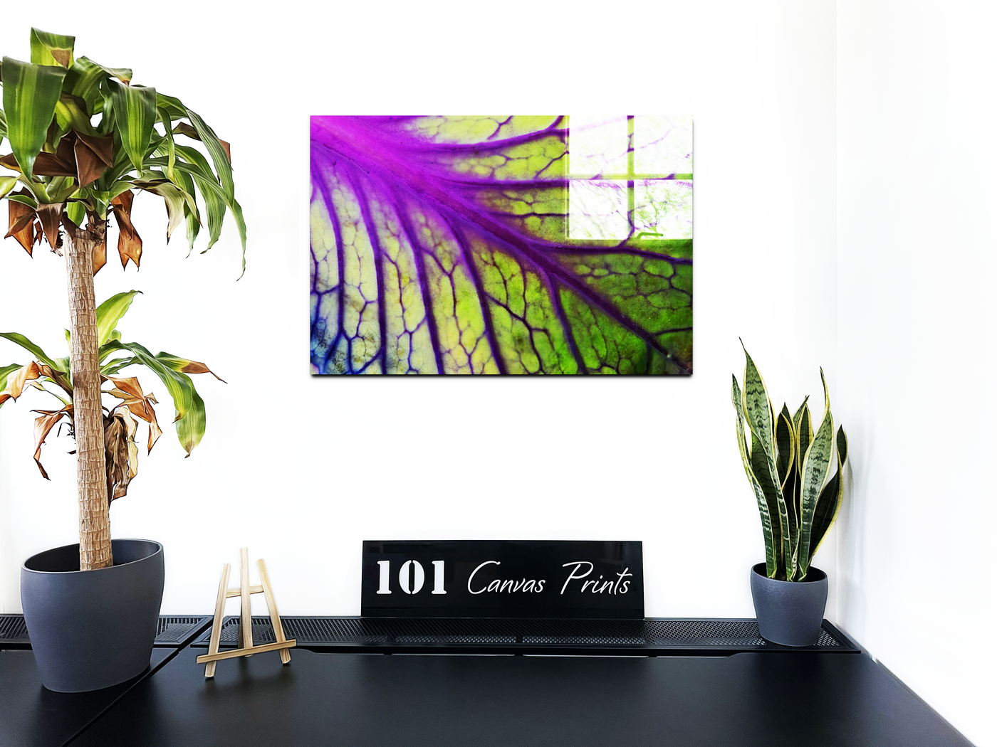 This remarkable macro photograph, expertly reproduced by the 101 Canvas Prints team, transforms a leaf's internal structure into a mesmerising work of abstract art. The image reveals the intricate networking of veins and cells with extraordinary clarity, creating a composition that balances scientific detail with artistic vision. Each purple vein stands out against the brilliant green background like brushstrokes on nature's canvas, revealing the sophisticated architecture that lies beneath the surface of every leaf.