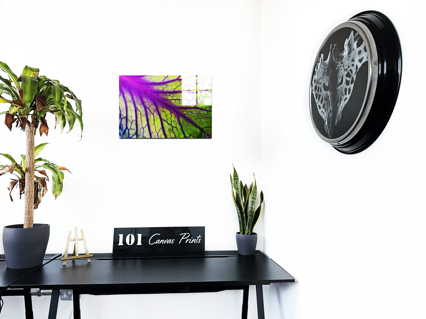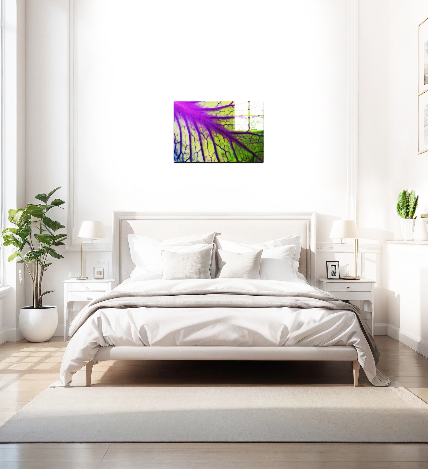 When presented in our premium Acrylic medium, this botanical masterpiece achieves an extraordinary level of visual impact. The high-gloss finish dramatically enhances the vibrancy of both the purples and greens, while the crystal-clear surface creates an almost three-dimensional effect that brings new life to the leaf's internal landscape. The way light interacts with our Acrylic prints adds an extra dimension to the viewing experience, making the leaf's structure appear to glow from within, much like it might appear when held up to natural sunlight. This stunning piece would be particularly effective in contemporary spaces where its vibrant colours and natural patterns can create maximum impact, from a modern home to a medical office or botanical institution.