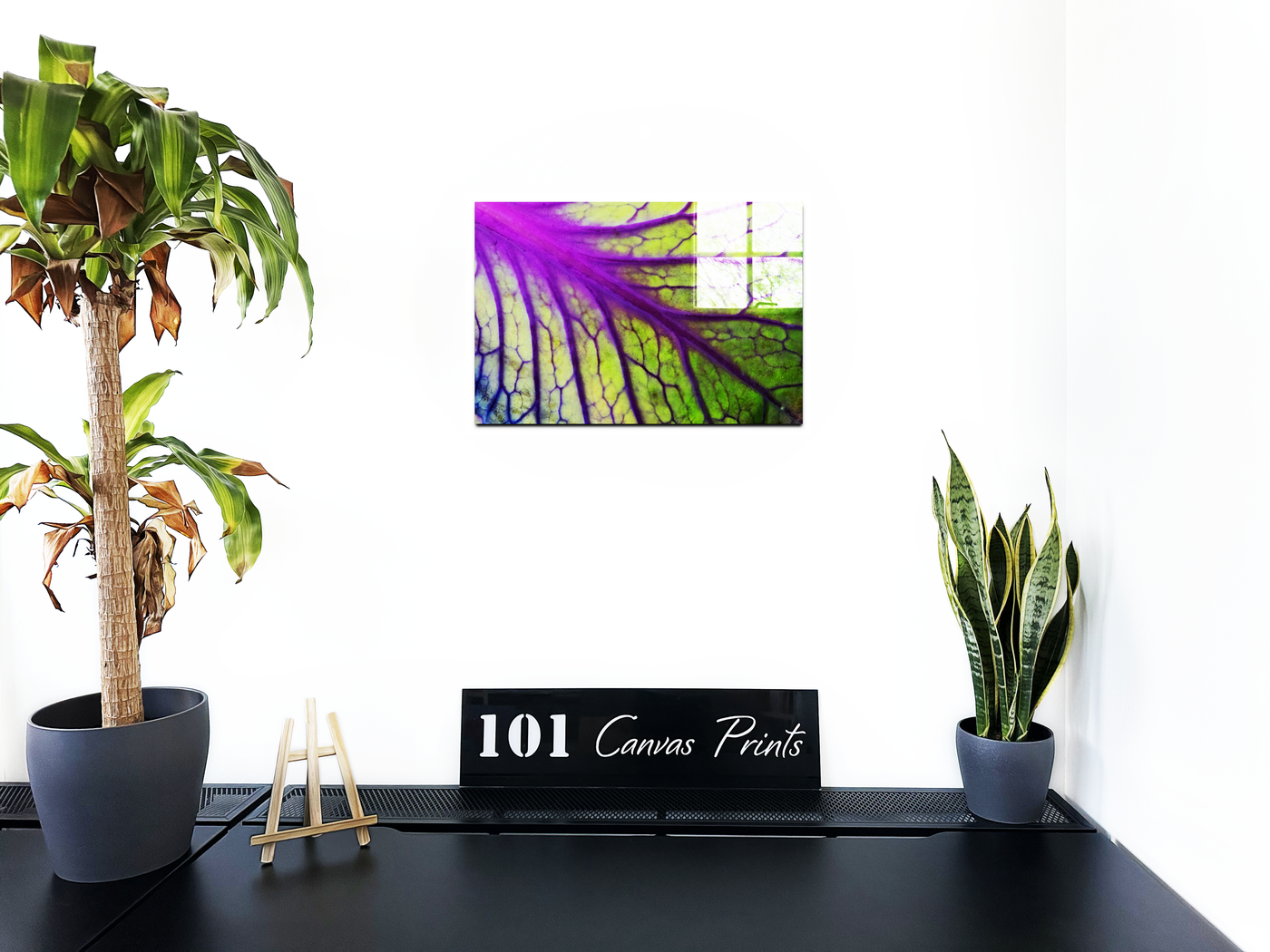 This remarkable macro photograph, expertly reproduced by the 101 Canvas Prints team, transforms a leaf's internal structure into a mesmerising work of abstract art. The image reveals the intricate networking of veins and cells with extraordinary clarity, creating a composition that balances scientific detail with artistic vision. Each purple vein stands out against the brilliant green background like brushstrokes on nature's canvas, revealing the sophisticated architecture that lies beneath the surface of every leaf.