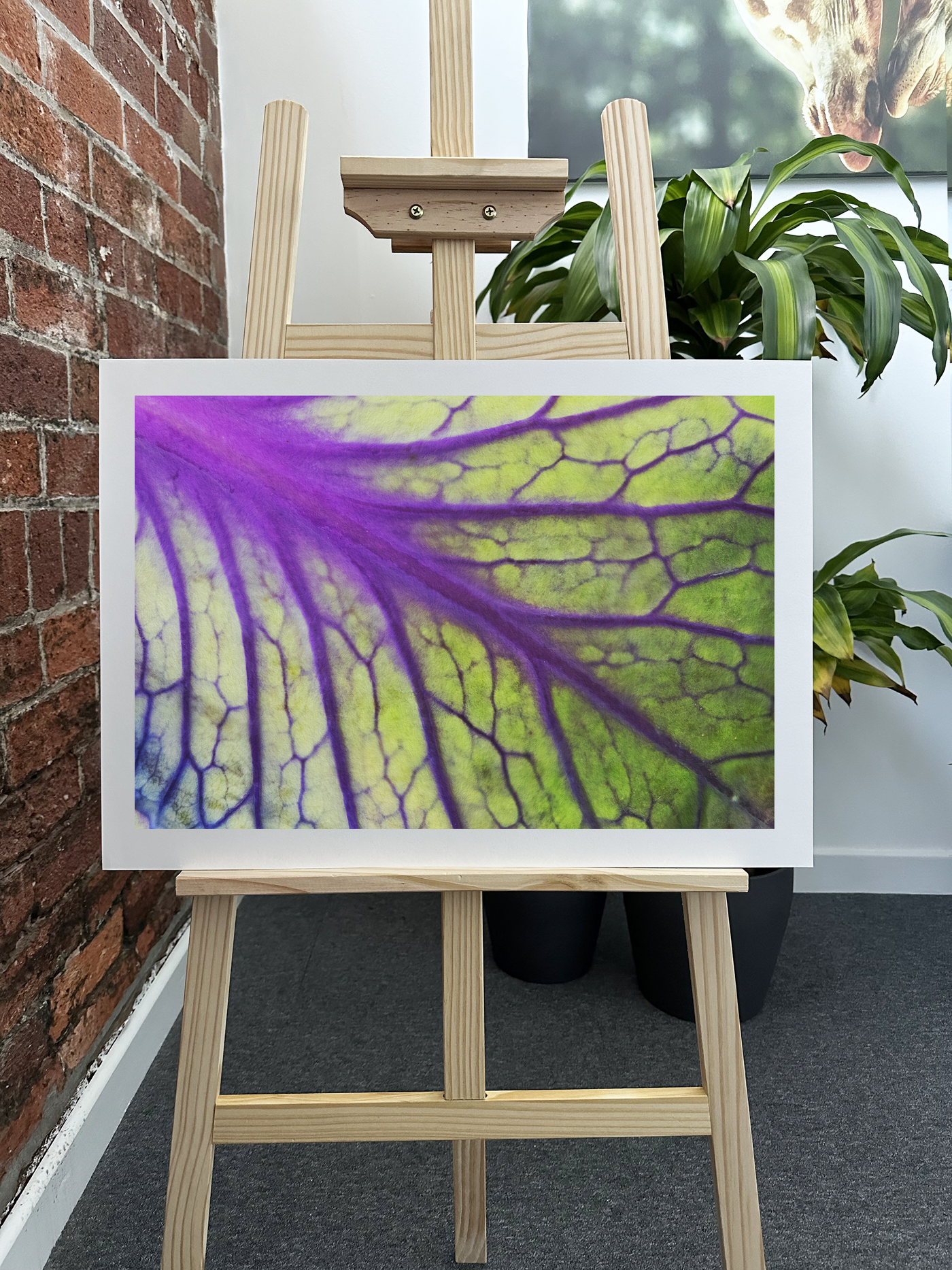 The photographer's masterful use of light and colour creates an almost bioluminescent effect, with deep purple veins contrasting dramatically against backgrounds that shift from acid green to gentle chartreuse. Through our precise photography and print enhancement process, we've maintained every subtle detail of this complex natural pattern, from the boldest veins to the finest cellular structures, ensuring that all the nuanced textures and colour transitions are preserved with perfect clarity.