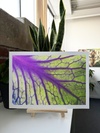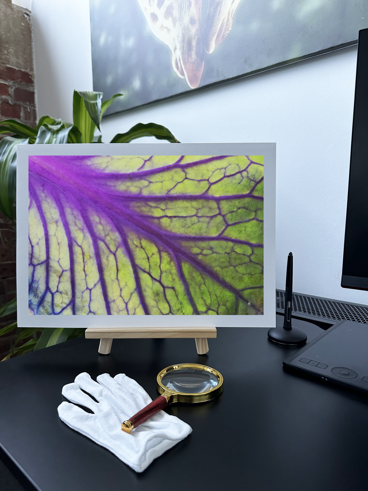 When presented on our premium Fine Art print paper, this botanical masterpiece achieves an extraordinary level of visual impact. The matt finish dramatically enhances the textures of both the purples and greens, while the colour gradients create an almost three-dimensional effect that brings new life to the leaf's internal landscape. The way light interacts with our Fine Art print adds an extra dimension to the viewing experience, making the leaf's structure appear to glow from within, much like it might appear when held up to natural sunlight. This stunning piece would be particularly effective in contemporary spaces where its vibrant colours and natural patterns can create maximum impact, from a modern home to a medical office or botanical institution.