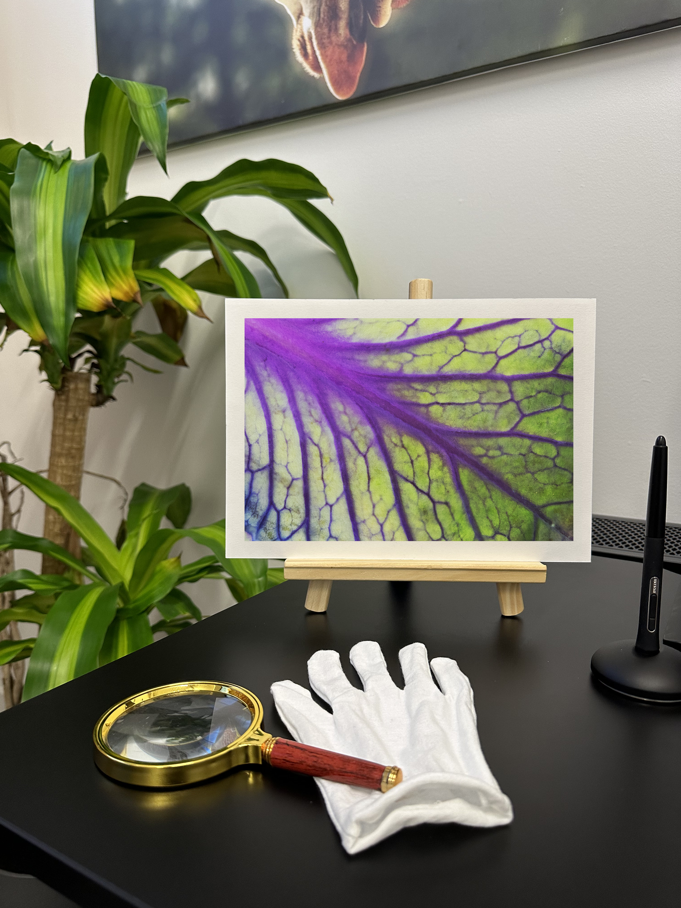 When presented on our premium Fine Art print paper, this botanical masterpiece achieves an extraordinary level of visual impact. The matt finish dramatically enhances the textures of both the purples and greens, while the colour gradients create an almost three-dimensional effect that brings new life to the leaf's internal landscape. The way light interacts with our Fine Art print adds an extra dimension to the viewing experience, making the leaf's structure appear to glow from within, much like it might appear when held up to natural sunlight. This stunning piece would be particularly effective in contemporary spaces where its vibrant colours and natural patterns can create maximum impact, from a modern home to a medical office or botanical institution.