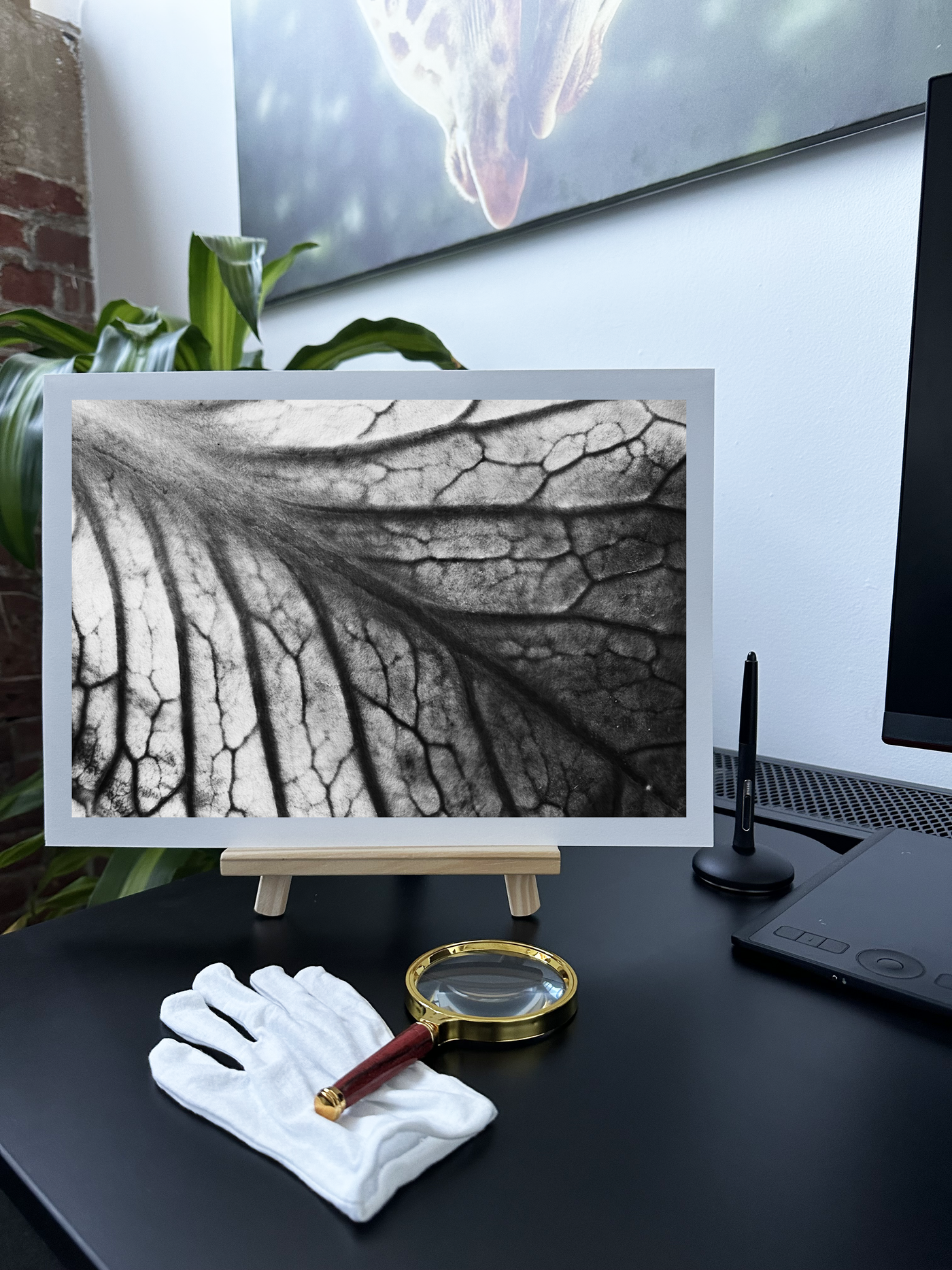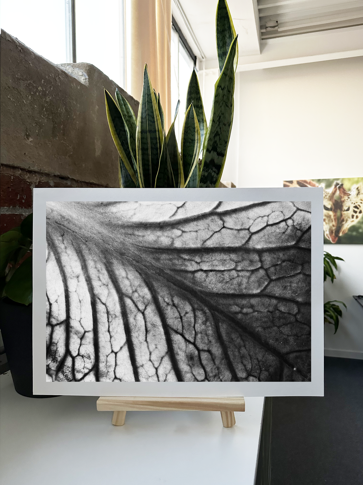 When presented on our premium Fine Art print paper, this botanical masterpiece achieves an extraordinary level of visual impact. The matt finish dramatically enhances the textures of both the light & dark tones, while the Monochromatic gradients create an almost three-dimensional effect that brings new life to the leaf's internal landscape. The way light interacts with our Fine Art print adds an extra dimension to the viewing experience, making the leaf's structure appear to glow from within, much like it might appear when held up to natural sunlight. This stunning piece would be particularly effective in contemporary spaces where its vibrant Monochromatic tones and natural patterns can create maximum impact, from a modern home to a medical office or botanical institution.